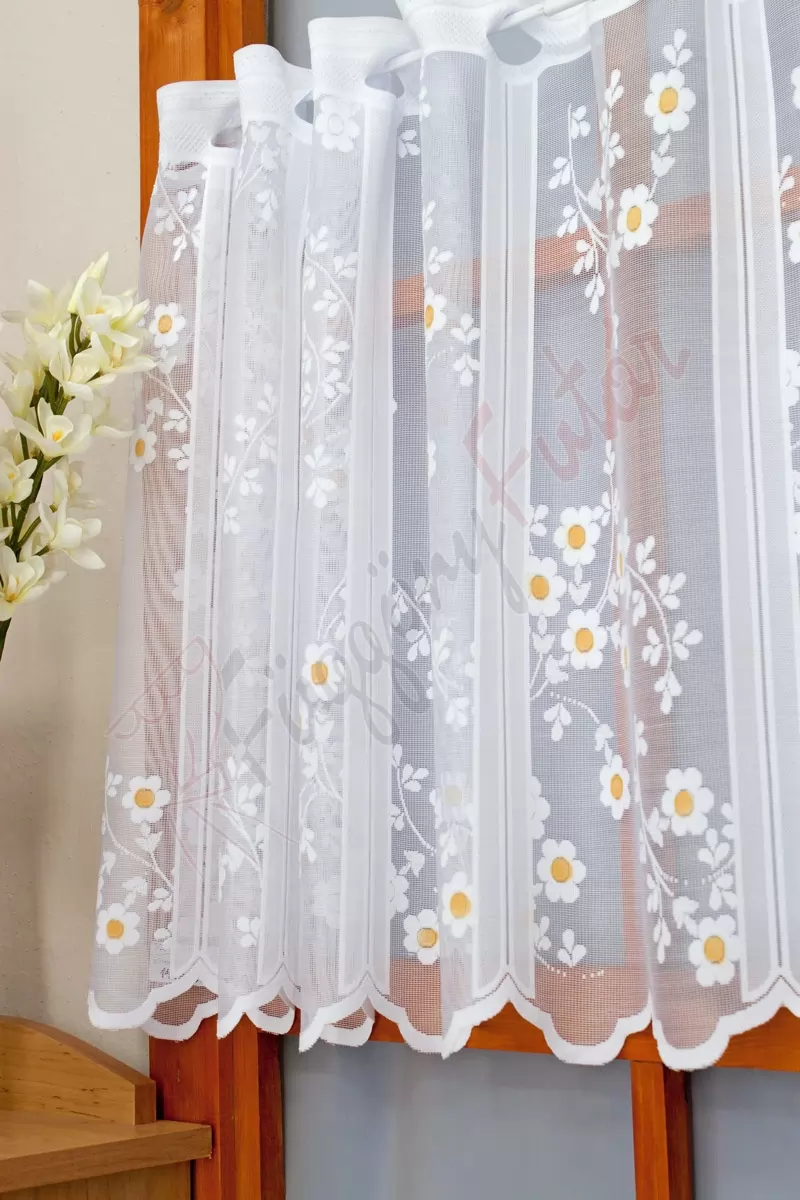 Vidámságot visz a gyerekszobákba, hálószobába és játszószobákba. Használhatjuk a konyhában, hogy energiával töltődjünk fel. Különösen alkalmas északi fekvésű szobákba. A hűvös, semleges szürkék remek ellentéte. Használjuk bátran kiemelésre és hangsúlykeltésre. A sárga mintás fényáteresztő függönyökhöz általában a sötétbarna, sötétkék, bordó, fekete és szürke színű sötétítő és dekorfüggönyök illenek legjobban.Anyaga: jacquard Csipkekötéshez hasonló technikával készült anyag, melyet elsősorban a romantikus vagy klasszikus lakberendezési stílus kedvelőinek ajánlunk. Nem szükséges különösebben vasalni , mosás után elég nedvesen felfüggeszteni, súlya miatt simára szárad (ahogy szokták mondani, "kihúzza" magát). 1.5x-es ráncolással ajánljuk.Vitrázsrudakhoz alkalmas függöny A függöny 45 cm magas. Méreténél fogva ún. kávéházi vagy vitrázs függgönyként használható, az ablak egy részének takarására alkalmas. A függöny alsó szegélye hullámos, ólomzsinór nem található benne.Vasalást kevésbé igénylő anyag Az anyag kevesebb vasalást igényel, mint az átlag függöny. Sokszor elég, ha mosás után még nedvesen a helyükre akasztjuk, így kilógva magát a ráncok kisimulnak és a függönyünk teljes pompájában ragyog!