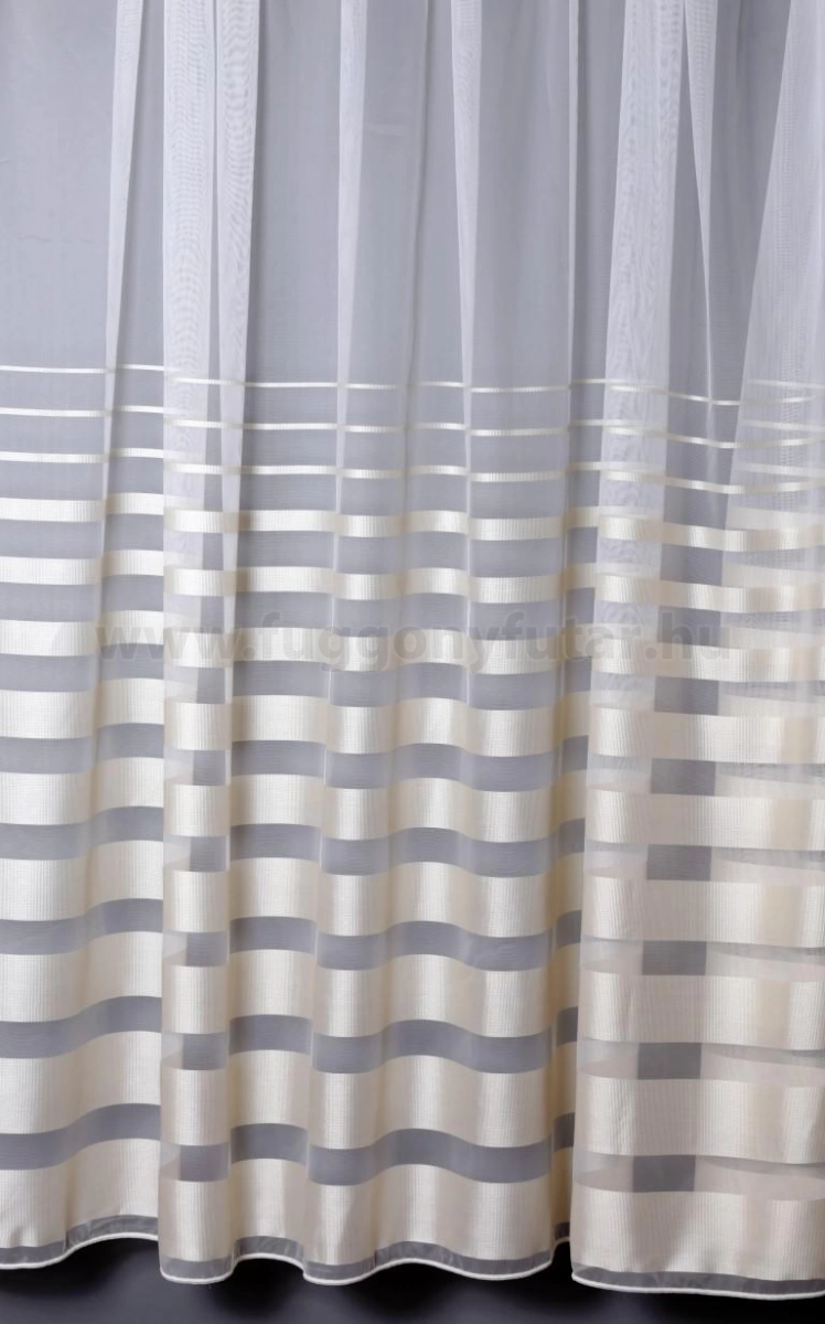 Bézs alapon változó szélességű csíkokkal díszített jacquard függöny.A függöny díszét a széles bordűr adja. A bordűr több sávból áll. A függöny felső része minta nélküli.Hálószobába, illetve nappaliba és irodába is ajánljuk.A vízszintes csíkok izgalmassá teszik a teret Az ilyen vízszintes csíkozású anyagokhoz válasszunk egyszínű, szórt vagy virágmintás sötétítőt. Ez a mintázat optikailag szélesíti a teret. A fehér szín légies és világos, fényt hoz a szobába A fehér a világosság és a tisztaság színe, egész nap érezhetjük a friss tavaszi szellő simogatását, ha egy szép fehér függöny díszíti az ablakunkat. A fehér színű fényáteresztő függönyöket bármilyen színű sötétítő függönnyel kombinálhatjuk, de a szoba falának színét mindig vegyük figyelembe.Ez a függöny többféle lakberendezési stílushoz is jól illeszthető Ez a függöny több lakberendezési irányzathoz is tökéletesen illeszkedik – legyen szó az Art deco ragyogásáról, a glamour luxusáról vagy a skandináv egyszerűségről. Anyaga diszkréten simul bele a térbe, miközben kiemeli a helyiség hangulatát. Ideális választás, ha olyan textilt keresünk, amely rugalmasan alkalmazkodik a meglévő bútorokhoz és kiegészítőkhöz.Drámai és luxus hatás A tél típusú anyagok merészek, elegánsak és egy csipetnyi drámát visznek a térbe. Színvilágukban az éles kontrasztok és a mély, gazdag ékszertónusok dominálnak, mint a smaragdzöld, a zafírkék, a rubinvörös, kiegészítve a feketével, fehérrel és fémes csillogással. Ideális a magabiztos, kifinomult személyiségeknek. Anyaga diszkréten simul bele a térbe, miközben kiemeli a helyiség hangulatát. Ideális választás, ha olyan textilt keresünk, amely rugalmasan alkalmazkodik a meglévő bútorokhoz és kiegészítőkhöz.Anyaga: sablé Változó vastagságú szálakból szőtt anyag. Kevésbé hajlamos a gyűrődésre , mint a voile. 1.5x-es ráncolással ajánljuk.Terasz ajtókhoz, nagyobb ablakok függönyözéséhez jól használható A karnistól a felső szegéshez szükséges anyagot beleszámítva legfeljebb 313 cm hosszú függönyt lehet belőle varrni, ez alatt bármilyen méretben elkészítjük. Méreténél fogva alkalmas lehet terasz- és erkélyajtók, nagy belmagasságú helyiségek valamint normál ablakok függönyözésére is. A függöny aljába gyárilag varrt ólomzsinór megfelelő esést kölcsönöz a függönynek, megakadályozza az indokolatlan fellebbenést és az apróbb ráncokat is kisimítja.Vasalást kevésbé igénylő anyag Az anyag kevesebb vasalást igényel, mint az átlag függöny. Sokszor elég, ha mosás után még nedvesen a helyükre akasztjuk, így kilógva magát a ráncok kisimulnak és a függönyünk teljes pompájában ragyog!