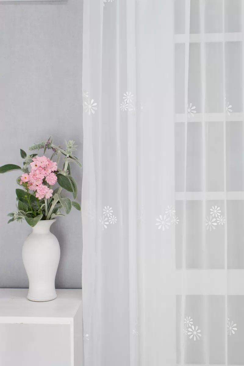 Kedves, vidám, mégsem tolakodó hatású ez a voile függöny. Nappaliba, hálószobába ajánljuk, visszafogott díszítése sokféle stílusú berendezéshez illeszthető. Fehér alapon fehér színű hímzett kis virágok díszítik rendezett sorokban.