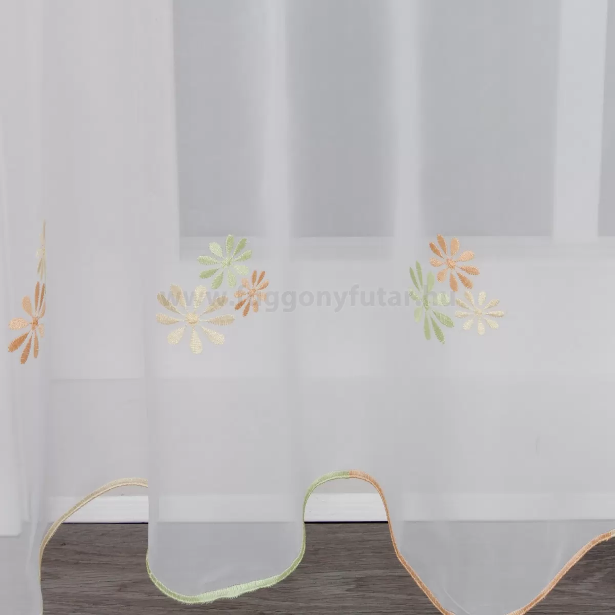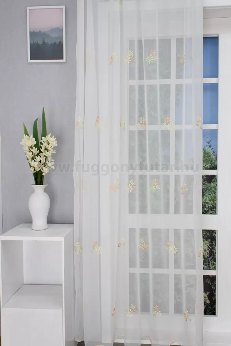 Kedves, vidám, mégsem tolakodó hatású ez a voile függöny. Nappaliba, hálószobába ajánljuk, visszafogott díszítése sokféle stílusú berendezéshez illeszthető. Fehér alapon fehér, sárga, zöld színű hímzett kis virágok díszítik rendezett sorokban. Teremtsünk romantikus hangulatot szobánkba ezzel a kellemes, virágmintás anyaggal! A virágminták vagy növényi minták mindig is népszerűek voltak a textiltervezők és lakberendezők körében, hiszen barátságossá és természetközelivé teszik otthonunkat. Egyszínű, színben harmonizáló textilekkel kombinálva romantikus stílust és kiegyensúlyozott megjelenést kölcsönözhetünk helyiségünknek. A fehér szín légies és világos, fényt hoz a szobába A fehér a világosság és a tisztaság színe, egész nap érezhetjük a friss tavaszi szellő simogatását, ha egy szép fehér függöny díszíti az ablakunkat. A fehér színű fényáteresztő függönyöket bármilyen színű sötétítő függönnyel kombinálhatjuk, de a szoba falának színét mindig vegyük figyelembe.Az otthon melegsége és kényelme Az ősz típusú textíliák a bekuckózós, meleg, hívogató hangulat megteremtésének mesterei. Színviláguk gazdag és földközeli: a rozsdabarna, a mustársárga, a terrakotta, a mélyzöld és a bézs árnyalatai jellemzik. Tökéletes választás a barátságos, gondoskodó személyiségeknek. Anyaga diszkréten simul bele a térbe, miközben kiemeli a helyiség hangulatát. Ideális választás, ha olyan textilt keresünk, amely rugalmasan alkalmazkodik a meglévő bútorokhoz és kiegészítőkhöz.Anyaga: voile Vékony, könnyed, fátyolszerű anyag . Az organzához képest vastagabb szálakból szövik, így kevésbé átlátszó, nehezebben gyűrődik, bár vasalást azért igényel (gőzölős vasalóval viszonylag könnyen, sérülésmentesen vasalható). 1.5x v. 2x-es ráncolással ajánljuk.Terasz ajtókhoz, nagyobb ablakok függönyözéséhez jól használható A karnistól a felső szegéshez szükséges anyagot beleszámítva legfeljebb 288 cm hosszú függönyt lehet belőle varrni, ez alatt bármilyen méretben elkészítjük. Méreténél fogva alkalmas lehet terasz- és erkélyajtók, nagy belmagasságú helyiségek valamint normál ablakok függönyözésére is. A függöny alsó szegélye hullámos, ólomzsinór nem található benne.