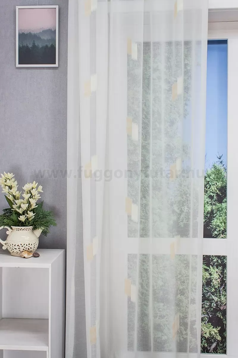 Ezt a tört fehér alapon fehér és krém színű sablé függönyt ismétlődő ecsetnyomszerű minták díszítik. Jól kezelhető, az anyagába hálószerűen belszövött erősebb szálak jó tartást biztosítanak.A geometrikus mintákkal otthonunk megtelik eleganciával, mégis egyszerű és modern marad Egyszerű formák ritmusos ismétlődése jellemzi legjobban ezt a geometrikus mintázatú anyagot. Egyszínű vagy visszafogott mintázatú sötétítővel párosítsuk, hogy hangsúlyos maradhasson a függöny formavilága. A bézs szín kellemes melegséggel árasztja el szobánkat Ez a meleg, természetes árnyalatú anyag remekül mutat bármilyen térben, amit otthonos, meleg színekkel szeretnénk berendezni. A bézs, mintás fényáteresztő függönyökhöz általában a sötétbarna, sötétkék, bordó, zöld, narancs, lila és szürke színű sötétítő és dekorfüggönyök illenek legjobban.Ez a függöny vintage lakberendezési stílushoz jól illeszthető Ez a függöny tökéletesen illeszkedik a vintage stílus nosztalgiájához. Anyaga diszkréten simul bele a térbe, miközben kiemeli a helyiség hangulatát. Ideális választás, ha olyan textilt keresünk, amely rugalmasan alkalmazkodik a meglévő bútorokhoz és kiegészítőkhöz.Az otthon melegsége és kényelme Az ősz típusú textíliák a bekuckózós, meleg, hívogató hangulat megteremtésének mesterei. Színviláguk gazdag és földközeli: a rozsdabarna, a mustársárga, a terrakotta, a mélyzöld és a bézs árnyalatai jellemzik. Tökéletes választás a barátságos, gondoskodó személyiségeknek. Anyaga diszkréten simul bele a térbe, miközben kiemeli a helyiség hangulatát. Ideális választás, ha olyan textilt keresünk, amely rugalmasan alkalmazkodik a meglévő bútorokhoz és kiegészítőkhöz.Anyaga: sablé Változó vastagságú szálakból szőtt anyag. Kevésbé hajlamos a gyűrődésre , mint a voile. 1.5x-es ráncolással ajánljuk.Terasz ajtókhoz, nagyobb ablakok függönyözéséhez jól használható A karnistól a felső szegéshez szükséges anyagot beleszámítva legfeljebb 303 cm hosszú függönyt lehet belőle varrni, ez alatt bármilyen méretben elkészítjük. Méreténél fogva alkalmas lehet terasz- és erkélyajtók, nagy belmagasságú helyiségek valamint normál ablakok függönyözésére is. A függöny aljába gyárilag varrt ólomzsinór megfelelő esést kölcsönöz a függönynek, megakadályozza az indokolatlan fellebbenést és az apróbb ráncokat is kisimítja.Vasalást kevésbé igénylő anyag Az anyag kevesebb vasalást igényel, mint az átlag függöny. Sokszor elég, ha mosás után még nedvesen a helyükre akasztjuk, így kilógva magát a ráncok kisimulnak és a függönyünk teljes pompájában ragyog!
