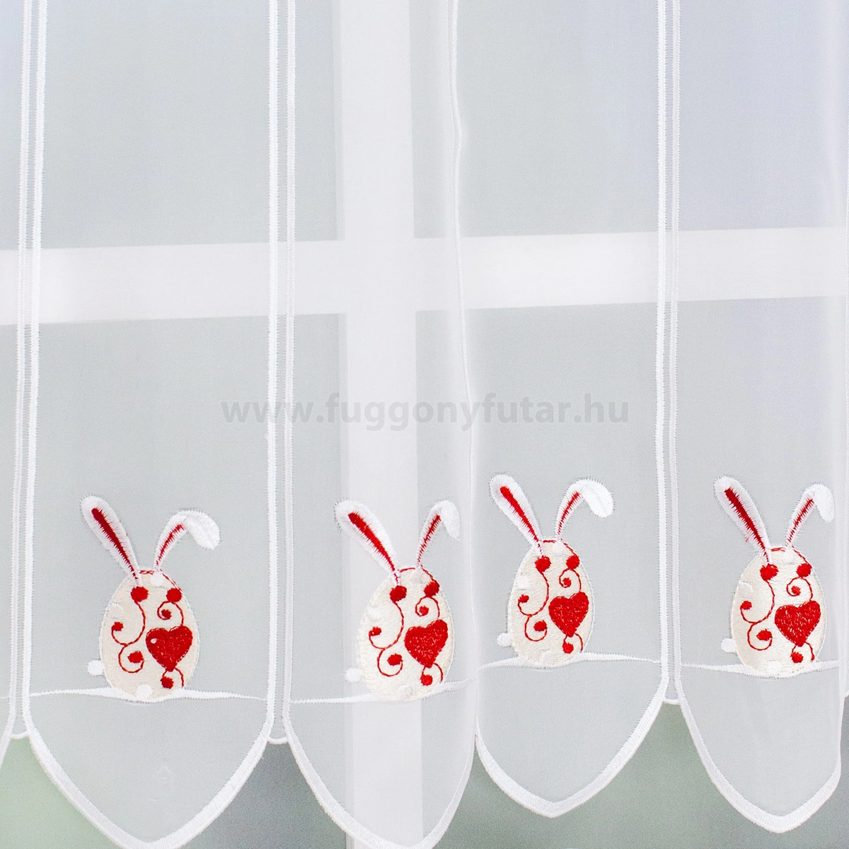 Hagyományos, romantikus stílusú ez a fehér, sablé vitrázs függöny. A fehér-piros hímzéses, indás-szíves díszítésű tojás-nyuszi vidám, ötletes figurája tavaszi hangulatot varázsol az otthonunkba. Felül hullámos, alul félköríves szegéssel díszítették.