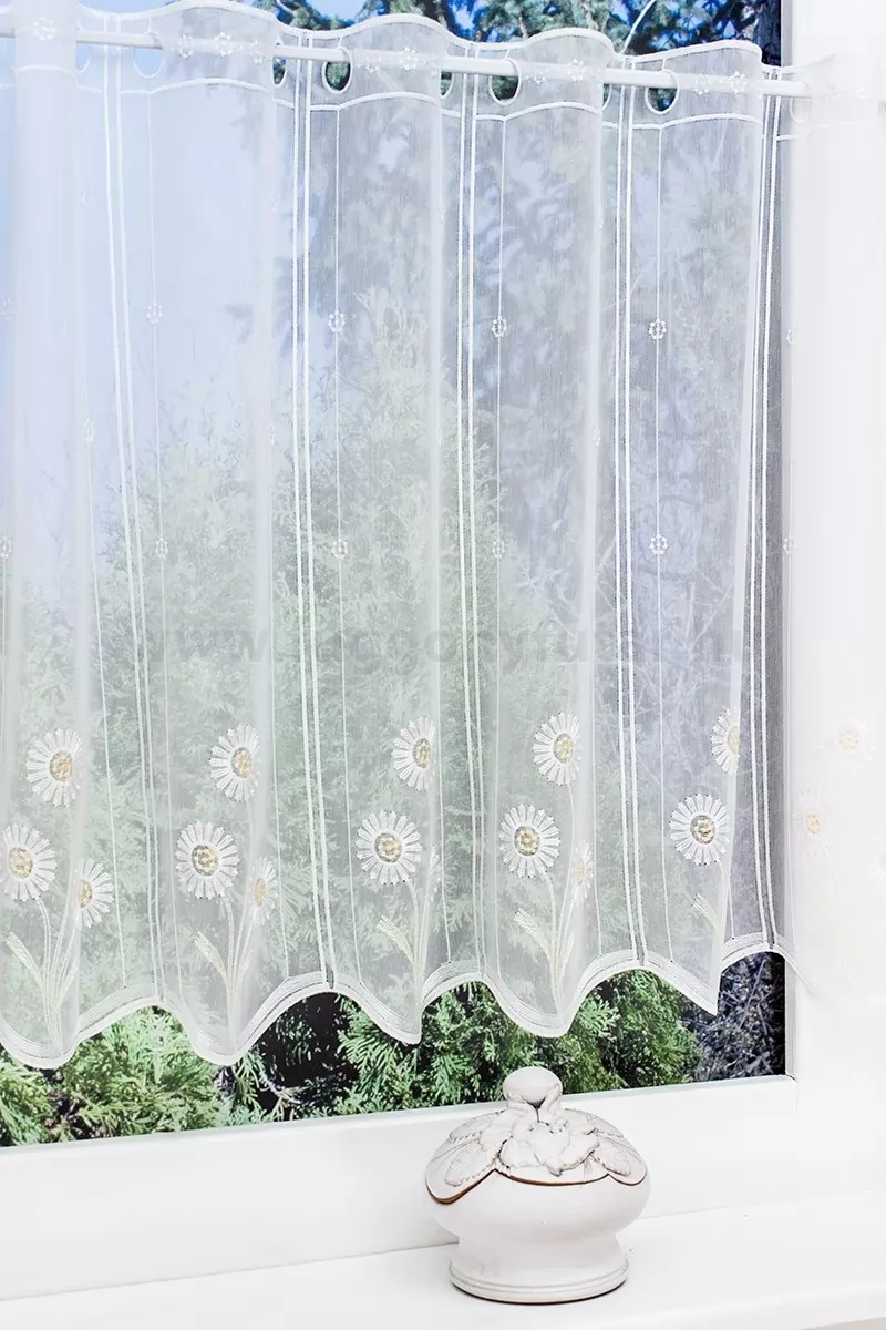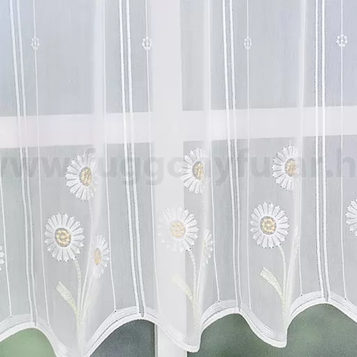 Romantikus, vidéki stílus kedvelőinek ajánljuk ezt a 10 cm-es oszlopokra osztott, kedves margarétákkal hímzett, fehér, sablé vitrázs függönyt. Felül egyenes, alul hullámos hímzett szegély zárja.Teremtsünk romantikus hangulatot szobánkba ezzel a kellemes, virágmintás anyaggal! A virágminták vagy növényi minták mindig is népszerűek voltak a textiltervezők és lakberendezők körében, hiszen barátságossá és természetközelivé teszik otthonunkat. Egyszínű, színben harmonizáló textilekkel kombinálva romantikus stílust és kiegyensúlyozott megjelenést kölcsönözhetünk helyiségünknek. A fehér szín légies és világos, fényt hoz a szobába A fehér a világosság és a tisztaság színe, egész nap érezhetjük a friss tavaszi szellő simogatását, ha egy szép fehér függöny díszíti az ablakunkat. A fehér színű fényáteresztő függönyöket bármilyen színű sötétítő függönnyel kombinálhatjuk, de a szoba falának színét mindig vegyük figyelembe.Ez a függöny vintage lakberendezési stílushoz jól illeszthető Ez a függöny tökéletesen illeszkedik a vintage stílus nosztalgiájához. Anyaga diszkréten simul bele a térbe, miközben kiemeli a helyiség hangulatát. Ideális választás, ha olyan textilt keresünk, amely rugalmasan alkalmazkodik a meglévő bútorokhoz és kiegészítőkhöz.A légies elegancia harmóniája A nyár típusú anyagok a kifinomult, hűvös eleganciát képviselik. Színvilágukban a hideg pasztellek, mint a levendula, a menta, a púderrózsaszín és a törtfehérek uralkodnak. Könnyed, szellős anyagaikkal nyugalmat és szofisztikált hangulatot teremtenek. Ideális választás a higgadt, elegáns személyiségeknek. Anyaga diszkréten simul bele a térbe, miközben kiemeli a helyiség hangulatát. Ideális választás, ha olyan textilt keresünk, amely rugalmasan alkalmazkodik a meglévő bútorokhoz és kiegészítőkhöz.Anyaga: sablé Változó vastagságú szálakból szőtt anyag. Kevésbé hajlamos a gyűrődésre , mint a voile. 1.5x-es ráncolással ajánljuk.Vitrázsrudakhoz alkalmas függöny A függöny 60 cm magas. Méreténél fogva ún. kávéházi vagy vitrázs függgönyként használható, az ablak egy részének takarására alkalmas.