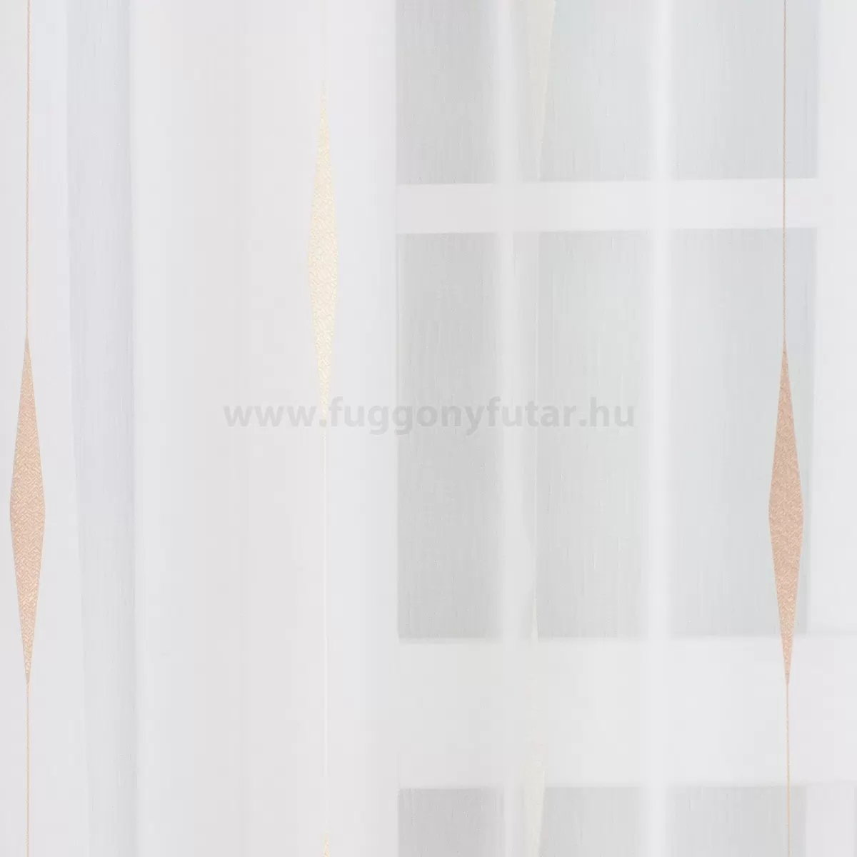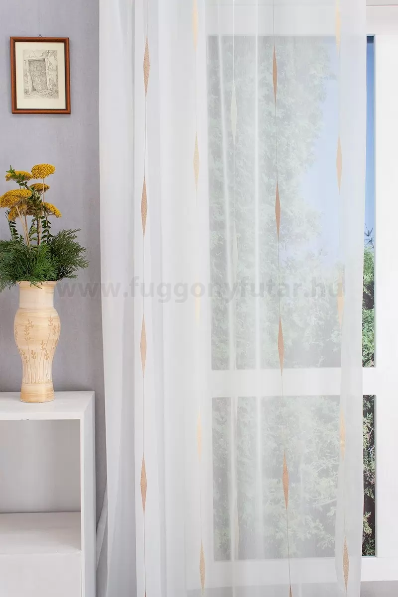 Modern stílusú szobákba, konyhákba ajánljuk ezt a fehér sablé függönyt. A függőleges hullámokon elhelyezett, fényesebb szálakból szövött, nyírt, vanília, arany, bronz rombusz minták érdekessé teszik az anyag felületét.A geometrikus mintákkal otthonunk megtelik eleganciával, mégis egyszerű és modern marad Egyszerű formák ritmusos ismétlődése jellemzi legjobban ezt a geometrikus mintázatú anyagot. Egyszínű vagy visszafogott mintázatú sötétítővel párosítsuk, hogy hangsúlyos maradhasson a függöny formavilága. A bézs szín kellemes melegséggel árasztja el szobánkat Ez a meleg, természetes árnyalatú anyag remekül mutat bármilyen térben, amit otthonos, meleg színekkel szeretnénk berendezni. A bézs, mintás fényáteresztő függönyökhöz általában a sötétbarna, sötétkék, bordó, zöld, narancs, lila és szürke színű sötétítő és dekorfüggönyök illenek legjobban.Ez a függöny vintage lakberendezési stílushoz jól illeszthető Ez a függöny tökéletesen illeszkedik a vintage stílus nosztalgiájához. Anyaga diszkréten simul bele a térbe, miközben kiemeli a helyiség hangulatát. Ideális választás, ha olyan textilt keresünk, amely rugalmasan alkalmazkodik a meglévő bútorokhoz és kiegészítőkhöz.Az otthon melegsége és kényelme Az ősz típusú textíliák a bekuckózós, meleg, hívogató hangulat megteremtésének mesterei. Színviláguk gazdag és földközeli: a rozsdabarna, a mustársárga, a terrakotta, a mélyzöld és a bézs árnyalatai jellemzik. Tökéletes választás a barátságos, gondoskodó személyiségeknek. Anyaga diszkréten simul bele a térbe, miközben kiemeli a helyiség hangulatát. Ideális választás, ha olyan textilt keresünk, amely rugalmasan alkalmazkodik a meglévő bútorokhoz és kiegészítőkhöz.Anyaga: sablé Változó vastagságú szálakból szőtt anyag. Kevésbé hajlamos a gyűrődésre , mint a voile. 1.5x-es ráncolással ajánljuk.Terasz ajtókhoz, nagyobb ablakok függönyözéséhez jól használható A karnistól a felső szegéshez szükséges anyagot beleszámítva legfeljebb 288 cm hosszú függönyt lehet belőle varrni, ez alatt bármilyen méretben elkészítjük. Méreténél fogva alkalmas lehet terasz- és erkélyajtók, nagy belmagasságú helyiségek valamint normál ablakok függönyözésére is. A függöny aljába gyárilag varrt ólomzsinór megfelelő esést kölcsönöz a függönynek, megakadályozza az indokolatlan fellebbenést és az apróbb ráncokat is kisimítja.