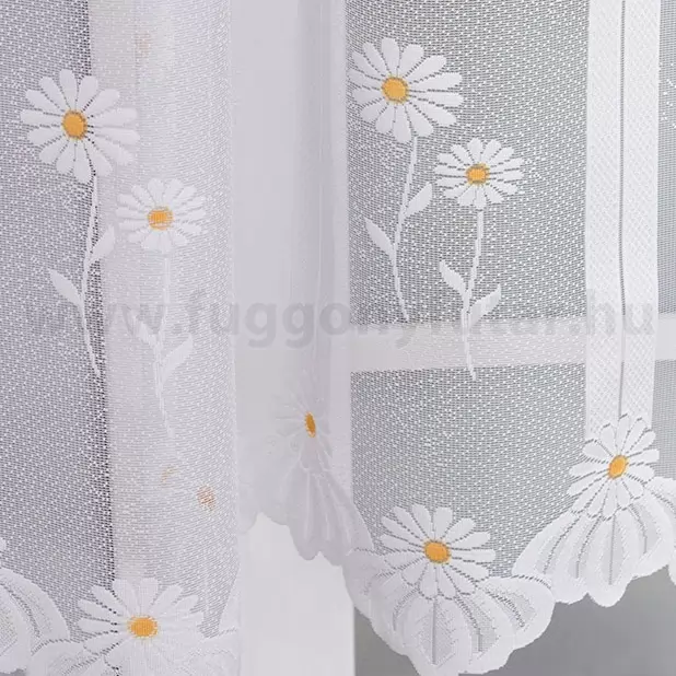 Nagyon könnyen kezelhető ez a fehér, margaréta mintás jacquard. 20 cm széles oszlopokban 15 cm magas virágok hajladoznak. Alul 10 cm-es virágos bordűr szegélyezi. Teremtsünk romantikus hangulatot szobánkba ezzel a kellemes, virágmintás anyaggal! A virágminták vagy növényi minták mindig is népszerűek voltak a textiltervezők és lakberendezők körében, hiszen barátságossá és természetközelivé teszik otthonunkat. Egyszínű, színben harmonizáló textilekkel kombinálva romantikus stílust és kiegyensúlyozott megjelenést kölcsönözhetünk helyiségünknek. A fehér szín légies és világos, fényt hoz a szobába A fehér a világosság és a tisztaság színe, egész nap érezhetjük a friss tavaszi szellő simogatását, ha egy szép fehér függöny díszíti az ablakunkat. A fehér színű fényáteresztő függönyöket bármilyen színű sötétítő függönnyel kombinálhatjuk, de a szoba falának színét mindig vegyük figyelembe.Ez a függöny vintage lakberendezési stílushoz jól illeszthető Ez a függöny tökéletesen illeszkedik a vintage stílus nosztalgiájához. Anyaga diszkréten simul bele a térbe, miközben kiemeli a helyiség hangulatát. Ideális választás, ha olyan textilt keresünk, amely rugalmasan alkalmazkodik a meglévő bútorokhoz és kiegészítőkhöz.Anyaga: jacquard Csipkekötéshez hasonló technikával készült anyag, melyet elsősorban a romantikus vagy klasszikus lakberendezési stílus kedvelőinek ajánlunk. Nem szükséges különösebben vasalni , mosás után elég nedvesen felfüggeszteni, súlya miatt simára szárad (ahogy szokták mondani, "kihúzza" magát). 1.5x-es ráncolással ajánljuk.Normál ablakok függönyözéséhez használható A karnistól a felső szegéshez szükséges anyagot beleszámítva legfeljebb 148 cm hosszú függönyt lehet belőle varrni, ez alatt bármilyen méretben elkészítjük. Méreténél fogva normál méretű ablakok függönyözésére alkalmas. A függöny alsó szegélye hullámos, ólomzsinór nem található benne.Vasalást kevésbé igénylő anyag Az anyag kevesebb vasalást igényel, mint az átlag függöny. Sokszor elég, ha mosás után még nedvesen a helyükre akasztjuk, így kilógva magát a ráncok kisimulnak és a függönyünk teljes pompájában ragyog!