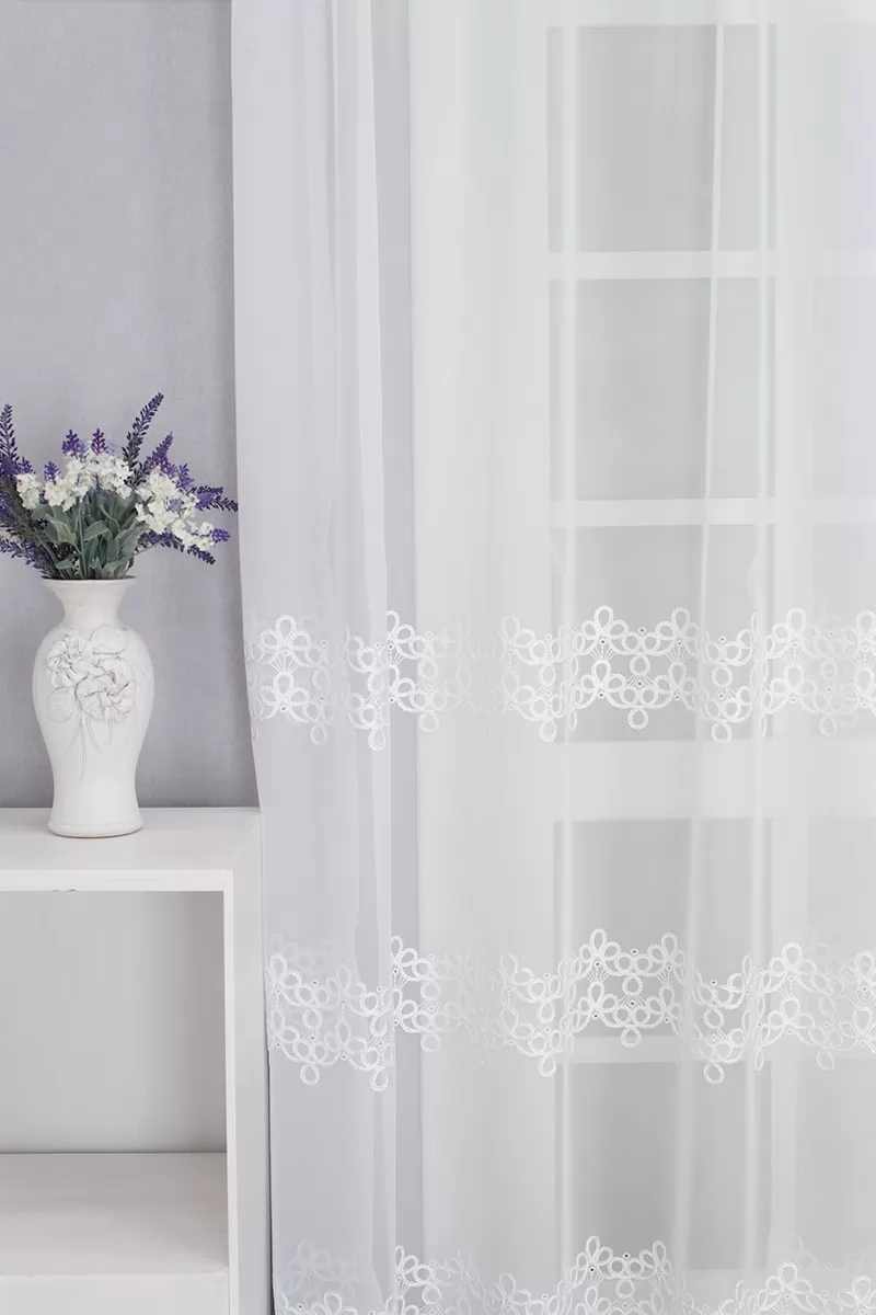 Klasszikus, romantikus stílusú szobákba ajánljuk ezt a bordűrös, tört fehér, voile függönyt. Alul hullámzó hímzés szegélyezi, három sorban 20 cm magas kacskaringós, hímzett, zsinóros indák díszítik. Fölötte két sorban ismétlődik ez a minta, súlyánál fogva jó tartást ad az anyagnak.
