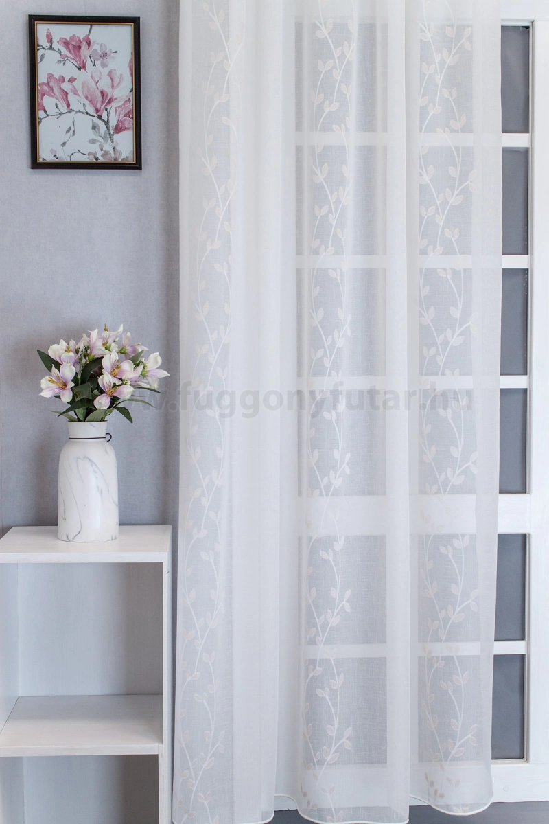 Kedves, derűs, tavaszias hangulatot áraszt ez a romantikus stílusú tört fehér sablet függöny. Hosszában halványan indás minta borítja. A sűrűbb, fényesebb fehér fonalú ágakon púderrózsaszín levélkék díszítik. A hátoldalán a minták nyírt szegélye látszódik. Alul ólomzsinór biztosít kellő tartást. Kímélő mosás után helyére akasztva szárítható, gőzölős vasalóval simítható. Teremtsünk romantikus hangulatot szobánkba ezzel a kellemes, virágmintás anyaggal! A virágminták vagy növényi minták mindig is népszerűek voltak a textiltervezők és lakberendezők körében, hiszen barátságossá és természetközelivé teszik otthonunkat. Egyszínű, színben harmonizáló textilekkel kombinálva romantikus stílust és kiegyensúlyozott megjelenést kölcsönözhetünk helyiségünknek. Egy vidám és nőies rózsaszín anyag Egy vidám és nőies rózsaszín anyag.