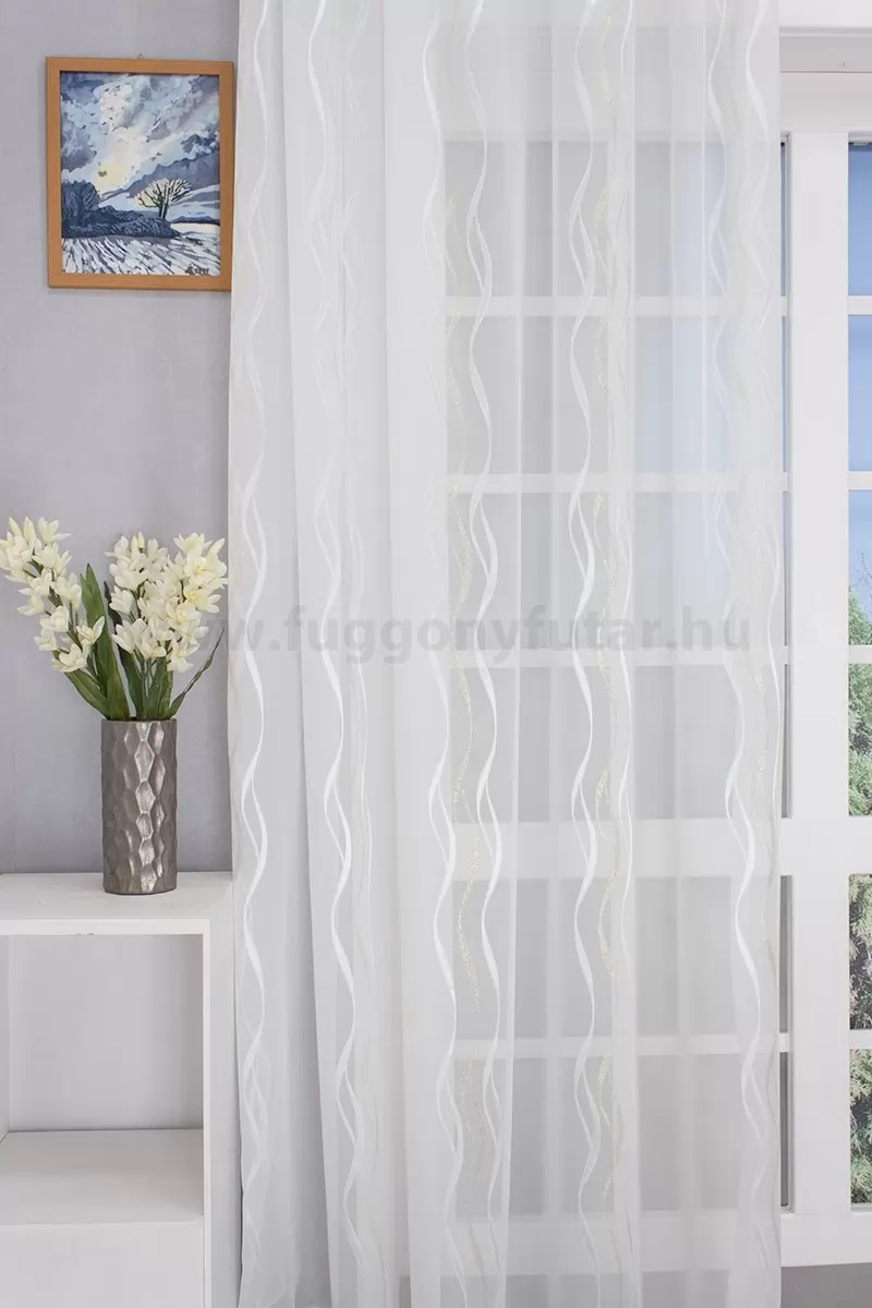 Modern stílusú bútorok között érvényesül igazán ez a bézs színű nagy, hullámzó ívekkel díszített voile függöny. A fényesebb, sűrűbb fehér, és arany szálakkal szőtt, nyírt, függőlegesen hullámzó ívek visszafogott, mégis ünnepélyes mintázata elegáns hatást vált ki. A lágy hullámminták nyugtatóan hatnak ránk A hullámminták a növényi indákat és leveleket idézik, ezáltal lágyságot visznek függönyünk megjelenésébe. Az egyszínű, minta nélküli vagy szórt mintás kiegészítő textilek illenek hozzá legjobban. A bézs szín kellemes melegséggel árasztja el szobánkat Ez a meleg, természetes árnyalatú anyag remekül mutat bármilyen térben, amit otthonos, meleg színekkel szeretnénk berendezni. A bézs, mintás fényáteresztő függönyökhöz általában a sötétbarna, sötétkék, bordó, zöld, narancs, lila és szürke színű sötétítő és dekorfüggönyök illenek legjobban.Ez a függöny többféle lakberendezési stílushoz is jól illeszthető Ez a függöny több lakberendezési irányzathoz is tökéletesen illeszkedik – legyen szó a klasszikus eleganciáról, a glamour luxusáról vagy az Art deco ragyogásáról. Anyaga diszkréten simul bele a térbe, miközben kiemeli a helyiség hangulatát. Ideális választás, ha olyan textilt keresünk, amely rugalmasan alkalmazkodik a meglévő bútorokhoz és kiegészítőkhöz.A megújulás energiája otthonában A tavasz típusú textíliák frissességet, optimizmust és energiát sugároznak. Színvilágukban a zsenge zöldek, a napsárgák, a barackos árnyalatok és a tiszta kékek dominálnak. Ez a stílus tökéletesen illik a dinamikus, vidám személyiségekhez. Anyaga diszkréten simul bele a térbe, miközben kiemeli a helyiség hangulatát. Ideális választás, ha olyan textilt keresünk, amely rugalmasan alkalmazkodik a meglévő bútorokhoz és kiegészítőkhöz.Anyaga: voile Vékony, könnyed, fátyolszerű anyag . Az organzához képest vastagabb szálakból szövik, így kevésbé átlátszó, nehezebben gyűrődik, bár vasalást azért igényel (gőzölős vasalóval viszonylag könnyen, sérülésmentesen vasalható). 1.5x v. 2x-es ráncolással ajánljuk.Normál ablakok függönyözéséhez használható A karnistól a felső szegéshez szükséges anyagot beleszámítva legfeljebb 218 cm hosszú függönyt lehet belőle varrni, ez alatt bármilyen méretben elkészítjük. Méreténél fogva normál méretű ablakok függönyözésére alkalmas. A függöny aljába gyárilag varrt ólomzsinór megfelelő esést kölcsönöz a függönynek, megakadályozza az indokolatlan fellebbenést és az apróbb ráncokat is kisimítja.