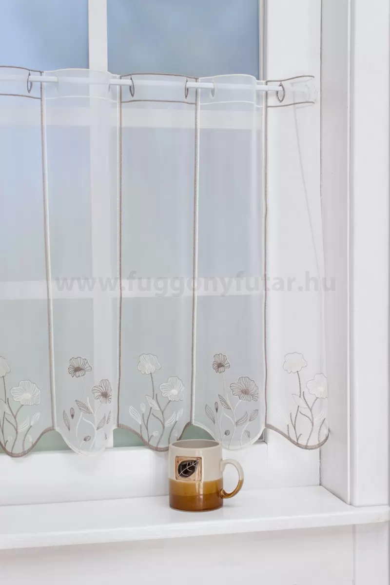 Áttetsző anyagú, voile vitrázs függöny. Az alsó részén kecsesen hajladozó fehér és bézs színű virágos hímzés teszi kedves hangulatúvá.Teremtsünk romantikus hangulatot szobánkba ezzel a kellemes, virágmintás anyaggal! A virágminták vagy növényi minták mindig is népszerűek voltak a textiltervezők és lakberendezők körében, hiszen barátságossá és természetközelivé teszik otthonunkat. Egyszínű, színben harmonizáló textilekkel kombinálva romantikus stílust és kiegyensúlyozott megjelenést kölcsönözhetünk helyiségünknek. A bézs szín kellemes melegséggel árasztja el szobánkat Ez a meleg, természetes árnyalatú anyag remekül mutat bármilyen térben, amit otthonos, meleg színekkel szeretnénk berendezni. A bézs, mintás fényáteresztő függönyökhöz általában a sötétbarna, sötétkék, bordó, zöld, narancs, lila és szürke színű sötétítő és dekorfüggönyök illenek legjobban.A megújulás energiája otthonában A tavasz típusú textíliák frissességet, optimizmust és energiát sugároznak. Színvilágukban a zsenge zöldek, a napsárgák, a barackos árnyalatok és a tiszta kékek dominálnak. Ez a stílus tökéletesen illik a dinamikus, vidám személyiségekhez. Anyaga diszkréten simul bele a térbe, miközben kiemeli a helyiség hangulatát. Ideális választás, ha olyan textilt keresünk, amely rugalmasan alkalmazkodik a meglévő bútorokhoz és kiegészítőkhöz.Anyaga: voile Vékony, könnyed, fátyolszerű anyag . Az organzához képest vastagabb szálakból szövik, így kevésbé átlátszó, nehezebben gyűrődik, bár vasalást azért igényel (gőzölős vasalóval viszonylag könnyen, sérülésmentesen vasalható). 1.5x v. 2x-es ráncolással ajánljuk.Vitrázsrudakhoz alkalmas függöny A függöny 60 cm magas. Méreténél fogva ún. kávéházi vagy vitrázs függgönyként használható, az ablak egy részének takarására alkalmas. A függöny alsó szegélye hullámos, ólomzsinór nem található benne.