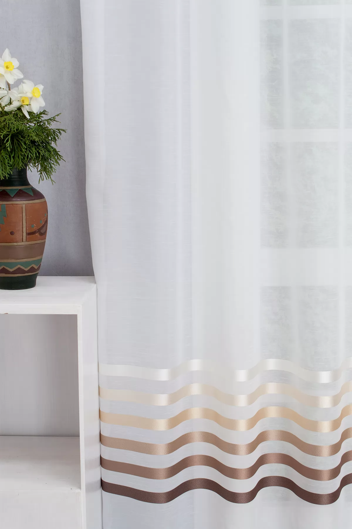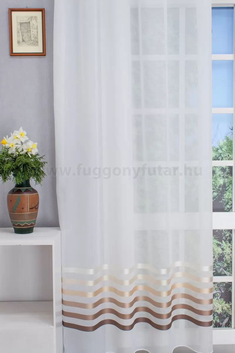 Bordűrös, bézs, barna csíkos, fehér sablet függöny,ólomzsinóros , 300 cm - egyedi méretre varrjuk! KIFUTÓ MODELL!
