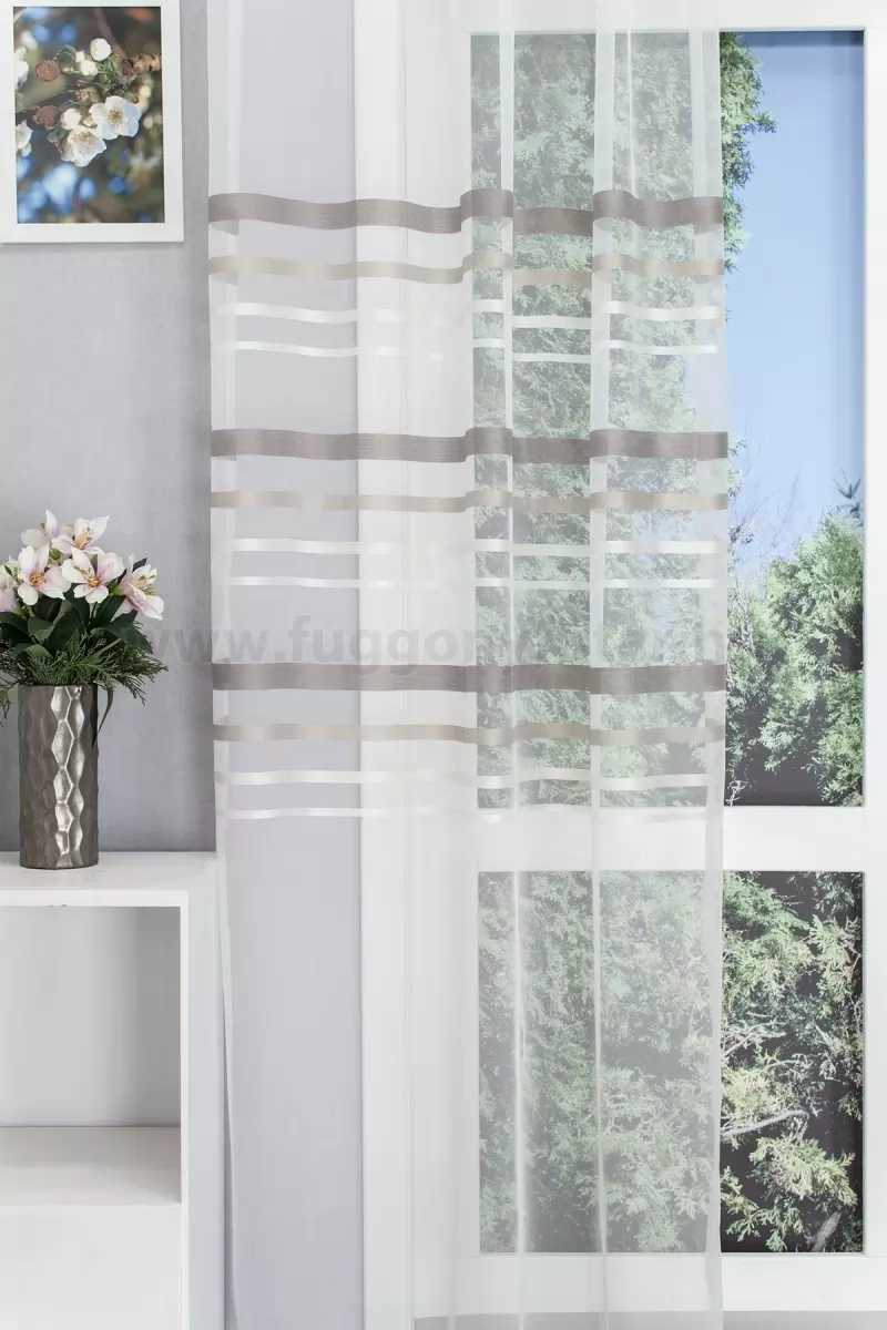 Modern stílusú berendezésekhez szépen illeszthető ez a tüll szerű, a fényt átengedő függöny. Középen selymes fényű fehér, barnás, illetve bézs csíkok teszik változatossá a felületét.A vízszintes csíkok izgalmassá teszik a teret Az ilyen vízszintes csíkozású anyagokhoz válasszunk egyszínű, szórt vagy virágmintás sötétítőt. Ez a mintázat optikailag szélesíti a teret. A fehér szín légies és világos, fényt hoz a szobába A fehér a világosság és a tisztaság színe, egész nap érezhetjük a friss tavaszi szellő simogatását, ha egy szép fehér függöny díszíti az ablakunkat. A fehér színű fényáteresztő függönyöket bármilyen színű sötétítő függönnyel kombinálhatjuk, de a szoba falának színét mindig vegyük figyelembe.Ez a függöny skandináv lakberendezési stílushoz jól illeszthető Ez a függöny tökéletesen illeszkedik a skandináv stílus egyszerűséghez. Anyaga diszkréten simul bele a térbe, miközben kiemeli a helyiség hangulatát. Ideális választás, ha olyan textilt keresünk, amely rugalmasan alkalmazkodik a meglévő bútorokhoz és kiegészítőkhöz.Az otthon melegsége és kényelme Az ősz típusú textíliák a bekuckózós, meleg, hívogató hangulat megteremtésének mesterei. Színviláguk gazdag és földközeli: a rozsdabarna, a mustársárga, a terrakotta, a mélyzöld és a bézs árnyalatai jellemzik. Tökéletes választás a barátságos, gondoskodó személyiségeknek. Anyaga diszkréten simul bele a térbe, miközben kiemeli a helyiség hangulatát. Ideális választás, ha olyan textilt keresünk, amely rugalmasan alkalmazkodik a meglévő bútorokhoz és kiegészítőkhöz.Anyaga: sablé Változó vastagságú szálakból szőtt anyag. Kevésbé hajlamos a gyűrődésre , mint a voile. 1.5x-es ráncolással ajánljuk.Terasz ajtókhoz, nagyobb ablakok függönyözéséhez jól használható A karnistól a felső szegéshez szükséges anyagot beleszámítva legfeljebb 288 cm hosszú függönyt lehet belőle varrni, ez alatt bármilyen méretben elkészítjük. Méreténél fogva alkalmas lehet terasz- és erkélyajtók, nagy belmagasságú helyiségek valamint normál ablakok függönyözésére is. A függöny aljába gyárilag varrt ólomzsinór megfelelő esést kölcsönöz a függönynek, megakadályozza az indokolatlan fellebbenést és az apróbb ráncokat is kisimítja.