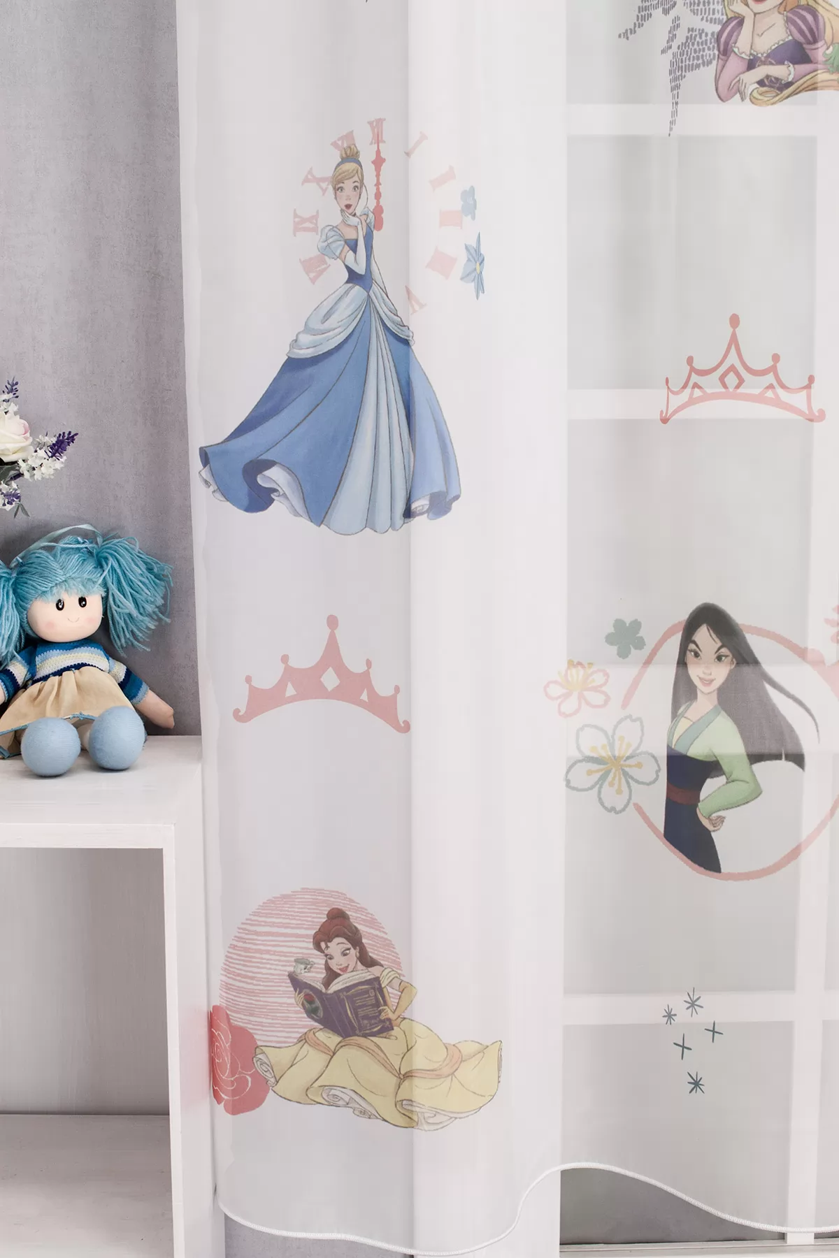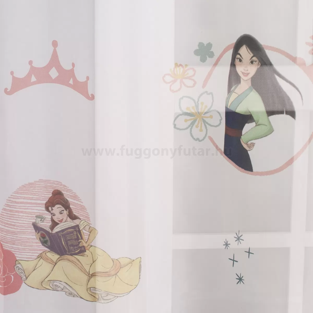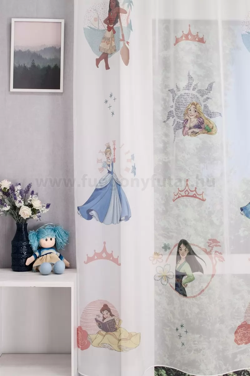 Fehér alapon nyomott mintás, hercegnős voile függöny kislányoknak. A minták a függöny felületén elszórva jelennek meg.A Disney mesefigurák a kicsik és nagyobbak kedvencei, a menő gyerekszobák elengedhetetlen kellékei Mindenki ismeri és szereti Walt Disney ötletes szereplőit. Olyan klasszikusoktól kezdve, mint Micimackó és Hófehérke, a Verdák és a Jégvarázs modern alakjáig. A Disney a világ leghíresebb szórakoztató cége. A függöny és tapétagyártók a Disney minták széles választékát kínálják, így a Disney figurákat közvetlenül otthonodba vihetjük. A fehér szín légies és világos, fényt hoz a szobába A fehér a világosság és a tisztaság színe, egész nap érezhetjük a friss tavaszi szellő simogatását, ha egy szép fehér függöny díszíti az ablakunkat. A fehér színű fényáteresztő függönyöket bármilyen színű sötétítő függönnyel kombinálhatjuk, de a szoba falának színét mindig vegyük figyelembe.A légies elegancia harmóniája A nyár típusú anyagok a kifinomult, hűvös eleganciát képviselik. Színvilágukban a hideg pasztellek, mint a levendula, a menta, a púderrózsaszín és a törtfehérek uralkodnak. Könnyed, szellős anyagaikkal nyugalmat és szofisztikált hangulatot teremtenek. Ideális választás a higgadt, elegáns személyiségeknek. Anyaga diszkréten simul bele a térbe, miközben kiemeli a helyiség hangulatát. Ideális választás, ha olyan textilt keresünk, amely rugalmasan alkalmazkodik a meglévő bútorokhoz és kiegészítőkhöz.Anyaga: voile Vékony, könnyed, fátyolszerű anyag . Az organzához képest vastagabb szálakból szövik, így kevésbé átlátszó, nehezebben gyűrődik, bár vasalást azért igényel (gőzölős vasalóval viszonylag könnyen, sérülésmentesen vasalható). 1.5x v. 2x-es ráncolással ajánljuk.Normál ablakok függönyözéséhez használható A karnistól a felső szegéshez szükséges anyagot beleszámítva legfeljebb 178 cm hosszú függönyt lehet belőle varrni, ez alatt bármilyen méretben elkészítjük. Méreténél fogva normál méretű ablakok függönyözésére alkalmas. A függöny aljába gyárilag varrt ólomzsinór megfelelő esést kölcsönöz a függönynek, megakadályozza az indokolatlan fellebbenést és az apróbb ráncokat is kisimítja.