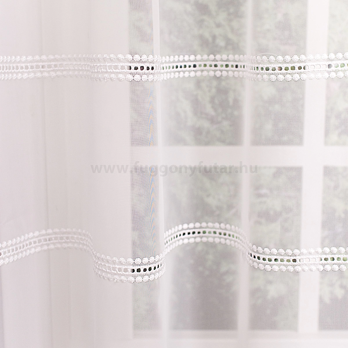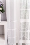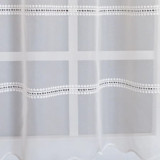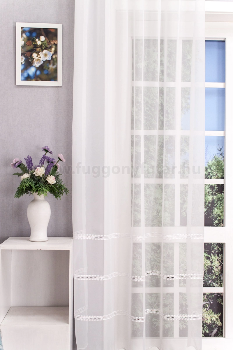 Hagyományos és a modern berendezésekhez is illik ez a fehér, lyukhímzéses voile függöny. Régi kézimunkákra emlékeztető díszítés módja otthonos hangulatot varázsol a szobába, étkezőbe. A vízszintes csíkok izgalmassá teszik a teret Az ilyen vízszintes csíkozású anyagokhoz válasszunk egyszínű, szórt vagy virágmintás sötétítőt. Ez a mintázat optikailag szélesíti a teret. A fehér szín légies és világos, fényt hoz a szobába A fehér a világosság és a tisztaság színe, egész nap érezhetjük a friss tavaszi szellő simogatását, ha egy szép fehér függöny díszíti az ablakunkat. A fehér színű fényáteresztő függönyöket bármilyen színű sötétítő függönnyel kombinálhatjuk, de a szoba falának színét mindig vegyük figyelembe.Ez a függöny skandináv lakberendezési stílushoz jól illeszthető Ez a függöny tökéletesen illeszkedik a skandináv stílus egyszerűséghez. Anyaga diszkréten simul bele a térbe, miközben kiemeli a helyiség hangulatát. Ideális választás, ha olyan textilt keresünk, amely rugalmasan alkalmazkodik a meglévő bútorokhoz és kiegészítőkhöz.Anyaga: voile Vékony, könnyed, fátyolszerű anyag . Az organzához képest vastagabb szálakból szövik, így kevésbé átlátszó, nehezebben gyűrődik, bár vasalást azért igényel (gőzölős vasalóval viszonylag könnyen, sérülésmentesen vasalható). 1.5x v. 2x-es ráncolással ajánljuk.Normál ablakok függönyözéséhez használható A karnistól a felső szegéshez szükséges anyagot beleszámítva legfeljebb 208 cm hosszú függönyt lehet belőle varrni, ez alatt bármilyen méretben elkészítjük. Méreténél fogva normál méretű ablakok függönyözésére alkalmas. A függöny alsó szegélye hullámos, ólomzsinór nem található benne.