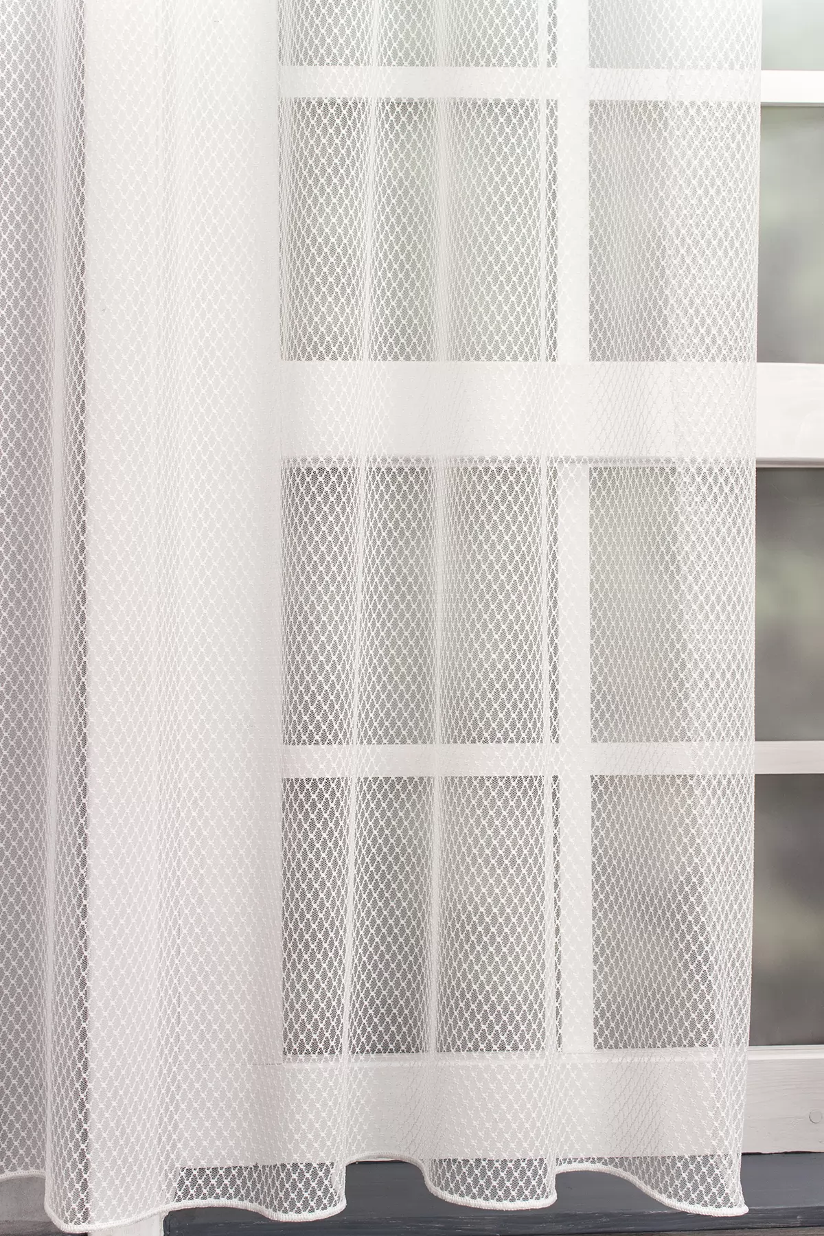 Minimal stílusú modern lakások, intézmények szép kiegészítője ez a rendkívül könnyen kezelhető rugalmas, hurkolt hálós szövésű jacquard függöny. Selymes fénye is tetszetőssé teszi. A geometrikus mintákkal otthonunk megtelik eleganciával, mégis egyszerű és modern marad Egyszerű formák ritmusos ismétlődése jellemzi legjobban ezt a geometrikus mintázatú anyagot. Egyszínű vagy visszafogott mintázatú sötétítővel párosítsuk, hogy hangsúlyos maradhasson a függöny formavilága. A fehér szín légies és világos, fényt hoz a szobába A fehér a világosság és a tisztaság színe, egész nap érezhetjük a friss tavaszi szellő simogatását, ha egy szép fehér függöny díszíti az ablakunkat. A fehér színű fényáteresztő függönyöket bármilyen színű sötétítő függönnyel kombinálhatjuk, de a szoba falának színét mindig vegyük figyelembe.Anyaga: jacquard Csipkekötéshez hasonló technikával készült anyag, melyet elsősorban a romantikus vagy klasszikus lakberendezési stílus kedvelőinek ajánlunk. Nem szükséges különösebben vasalni , mosás után elég nedvesen felfüggeszteni, súlya miatt simára szárad (ahogy szokták mondani, "kihúzza" magát). 1.5x-es ráncolással ajánljuk.Terasz ajtókhoz, nagyobb ablakok függönyözéséhez jól használható A karnistól a felső szegéshez szükséges anyagot beleszámítva legfeljebb 328 cm hosszú függönyt lehet belőle varrni, ez alatt bármilyen méretben elkészítjük. Méreténél fogva alkalmas lehet terasz- és erkélyajtók, nagy belmagasságú helyiségek valamint normál ablakok függönyözésére is. A függöny aljába gyárilag varrt ólomzsinór megfelelő esést kölcsönöz a függönynek, megakadályozza az indokolatlan fellebbenést és az apróbb ráncokat is kisimítja.Vasalást kevésbé igénylő anyag Az anyag kevesebb vasalást igényel, mint az átlag függöny. Sokszor elég, ha mosás után még nedvesen a helyükre akasztjuk, így kilógva magát a ráncok kisimulnak és a függönyünk teljes pompájában ragyog!