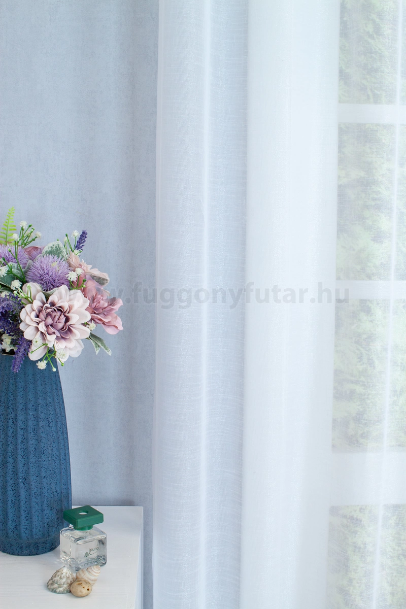 Fehér színű csillogó felületű sablé függöny. A szórt mintás anyagok izgalmas felülete bármely helyiségben jól mutat Az anyag teljes felületén elszórtan megjelenő ritkább-sűrűbb szálbeszövések izgalmas felületet hoznak létre. Bármilyen, színben harmonizáló, mintás anyagot remekül párosíthatunk hozzá. A fehér szín légies és világos, fényt hoz a szobába A fehér a világosság és a tisztaság színe, egész nap érezhetjük a friss tavaszi szellő simogatását, ha egy szép fehér függöny díszíti az ablakunkat. A fehér színű fényáteresztő függönyöket bármilyen színű sötétítő függönnyel kombinálhatjuk, de a szoba falának színét mindig vegyük figyelembe.Diszkrét csillogás elegáns megjelenéssel A csillámos szállal átszőtt függönyök finoman tükrözik a fényt, így visszafogott, mégis látványos hatást keltenek. Lágy ragyogásuk elegánsan kiemeli az ablakot, legyen szó modern, klasszikus vagy glamour enteriőrről.Ez a függöny többféle lakberendezési stílushoz is jól illeszthető Ez a függöny több lakberendezési irányzathoz is tökéletesen illeszkedik – legyen szó a klasszikus eleganciáról, a glamour luxusáról vagy az Art deco ragyogásáról. Anyaga diszkréten simul bele a térbe, miközben kiemeli a helyiség hangulatát. Ideális választás, ha olyan textilt keresünk, amely rugalmasan alkalmazkodik a meglévő bútorokhoz és kiegészítőkhöz.A légies elegancia harmóniája A nyár típusú anyagok a kifinomult, hűvös eleganciát képviselik. Színvilágukban a hideg pasztellek, mint a levendula, a menta, a púderrózsaszín és a törtfehérek uralkodnak. Könnyed, szellős anyagaikkal nyugalmat és szofisztikált hangulatot teremtenek. Ideális választás a higgadt, elegáns személyiségeknek. Anyaga diszkréten simul bele a térbe, miközben kiemeli a helyiség hangulatát. Ideális választás, ha olyan textilt keresünk, amely rugalmasan alkalmazkodik a meglévő bútorokhoz és kiegészítőkhöz.Anyaga: sablé Változó vastagságú szálakból szőtt anyag. Kevésbé hajlamos a gyűrődésre , mint a voile. 1.5x-es ráncolással ajánljuk.Terasz ajtókhoz, nagyobb ablakok függönyözéséhez jól használható A karnistól a felső szegéshez szükséges anyagot beleszámítva legfeljebb 298 cm hosszú függönyt lehet belőle varrni, ez alatt bármilyen méretben elkészítjük. Méreténél fogva alkalmas lehet terasz- és erkélyajtók, nagy belmagasságú helyiségek valamint normál ablakok függönyözésére is. A függöny aljába gyárilag varrt ólomzsinór megfelelő esést kölcsönöz a függönynek, megakadályozza az indokolatlan fellebbenést és az apróbb ráncokat is kisimítja.Vasalást kevésbé igénylő anyag Az anyag kevesebb vasalást igényel, mint az átlag függöny. Sokszor elég, ha mosás után még nedvesen a helyükre akasztjuk, így kilógva magát a ráncok kisimulnak és a függönyünk teljes pompájában ragyog!