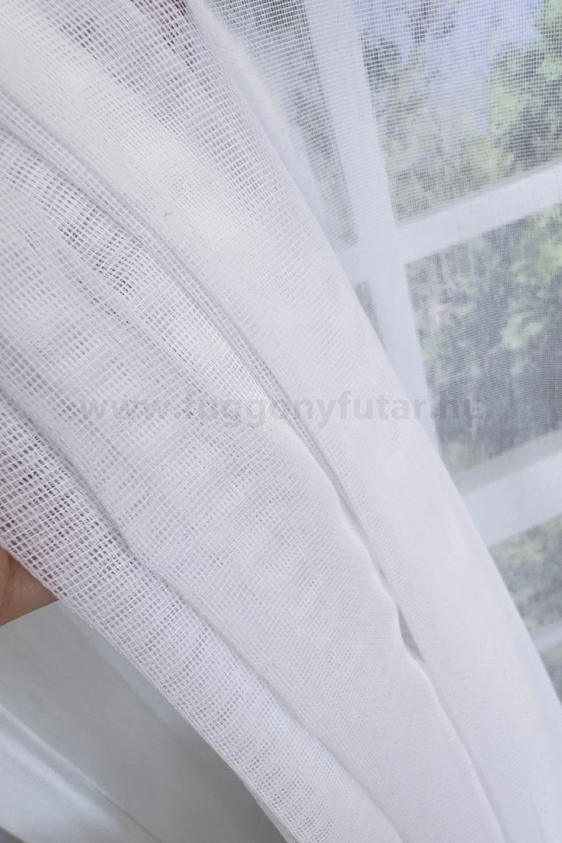 Fehér színű, lángálló tanúsítvánnyal rendelkező sablé függöny hálószerű textúrával. Természetes hatású, könnyen kezelhető függöny.A minta nélküli anyagok univerzálisak, jól passzolnak bármihez A minta nélküli anyagokhoz bármilyen színben harmonizáló mintás anyagot, tapétát remekül párosíthatunk. A fehér szín légies és világos, fényt hoz a szobába A fehér a világosság és a tisztaság színe, egész nap érezhetjük a friss tavaszi szellő simogatását, ha egy szép fehér függöny díszíti az ablakunkat. A fehér színű fényáteresztő függönyöket bármilyen színű sötétítő függönnyel kombinálhatjuk, de a szoba falának színét mindig vegyük figyelembe.Égéskésleltetett anyagból készült A lángálló (égéskésleltetett) függöny textíliák legfontosabb tulajdonsága, hogy nem kapnak lángra, nem lángolnak, nem terjesztik a tűzet és nem bocsátnak ki mérgező gázokat, csak egyszerűen elolvadnak. Ez a függöny ilyen lángálló tulajdonsággal rendelkezik, használat és tisztítás következtében sem veszíti el ezt a képességét. Sok közintézményben, a szolgáltató és vendéglátóiparban csak ilyen típusú minősített bizonyítvánnyal rendelkező anyagok használhatók függönyözésre. Kiemelten ajánljuk irodáknak, konferenciahelyiségeknek, egészségügyi és oktatási intézményeknek, színházaknak és mozi termeknek, illetve vendéglátóhelyeknek – szállodáknak és éttermeknek.Ez a függöny többféle lakberendezési stílushoz is jól illeszthető Ez a függöny több lakberendezési irányzathoz is tökéletesen illeszkedik – legyen szó a glamour luxusáról, a minimál letisztultságról, a klasszikus eleganciáról, a vintage nosztalgiáról, a skandináv egyszerűségről, az industrial stílus karakteréről, a mediterrán könnyedségről vagy az Art deco ragyogásáról. Anyaga diszkréten simul bele a térbe, miközben kiemeli a helyiség hangulatát. Ideális választás, ha olyan textilt keresünk, amely rugalmasan alkalmazkodik a meglévő bútorokhoz és kiegészítőkhöz.Anyaga: sablé Változó vastagságú szálakból szőtt anyag. Kevésbé hajlamos a gyűrődésre , mint a voile. 1.5x-es ráncolással ajánljuk.Terasz ajtókhoz, nagyobb ablakok függönyözéséhez jól használható A karnistól a felső szegéshez szükséges anyagot beleszámítva legfeljebb 298 cm hosszú függönyt lehet belőle varrni, ez alatt bármilyen méretben elkészítjük. Méreténél fogva alkalmas lehet terasz- és erkélyajtók, nagy belmagasságú helyiségek valamint normál ablakok függönyözésére is. A függöny aljába gyárilag varrt ólomzsinór megfelelő esést kölcsönöz a függönynek, megakadályozza az indokolatlan fellebbenést és az apróbb ráncokat is kisimítja.