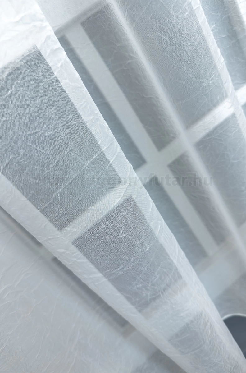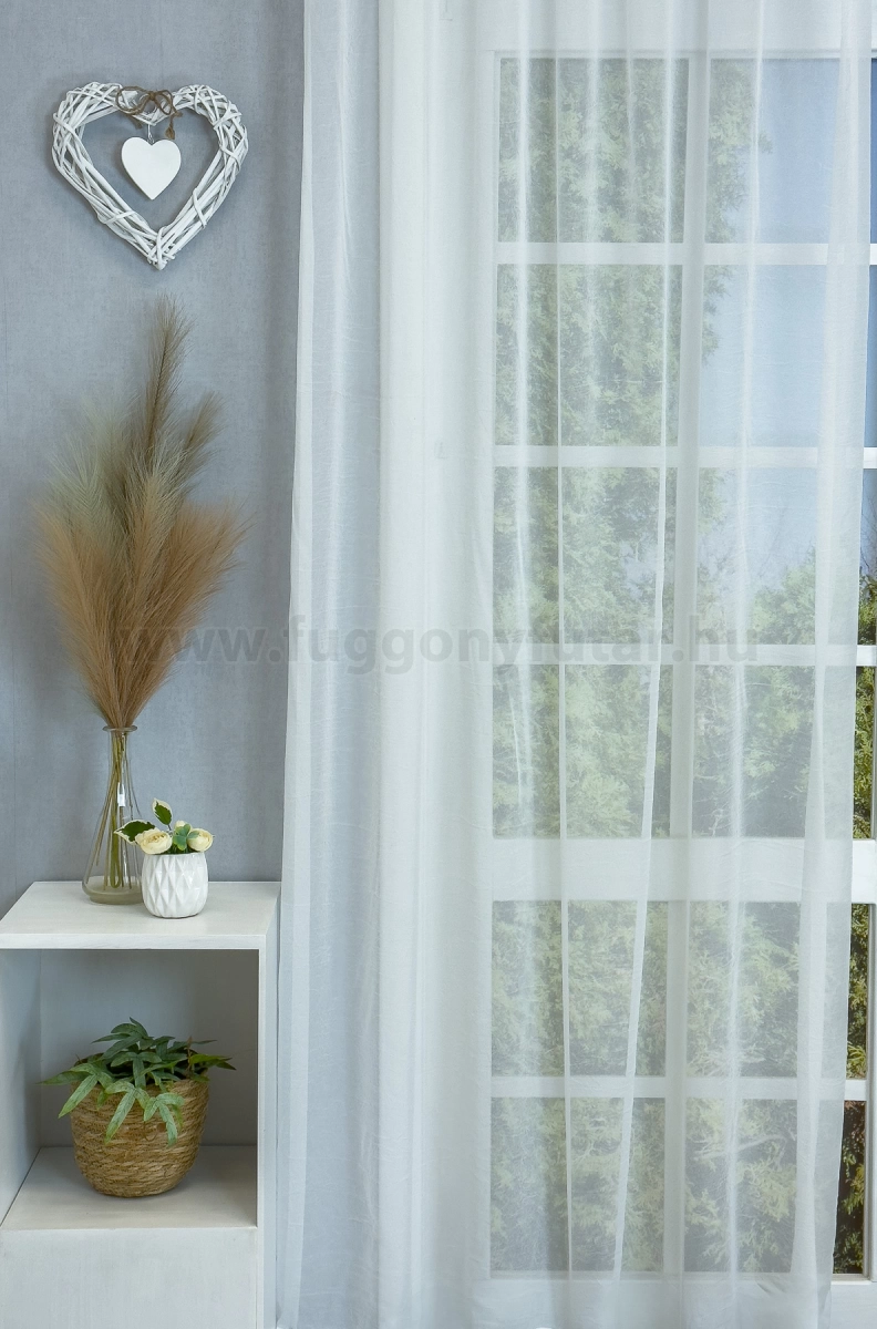 Gyűrt anyagú voile függöny, vasalást kevésbé igényel. Strukturált felülete jól mutat az ablakon.A szórt mintás anyagok izgalmas felülete bármely helyiségben jól mutat Az anyag teljes felületén elszórtan megjelenő ritkább-sűrűbb szálbeszövések izgalmas felületet hoznak létre. Bármilyen, színben harmonizáló, mintás anyagot remekül párosíthatunk hozzá. A fehér szín légies és világos, fényt hoz a szobába A fehér a világosság és a tisztaság színe, egész nap érezhetjük a friss tavaszi szellő simogatását, ha egy szép fehér függöny díszíti az ablakunkat. A fehér színű fényáteresztő függönyöket bármilyen színű sötétítő függönnyel kombinálhatjuk, de a szoba falának színét mindig vegyük figyelembe.Ez a függöny többféle lakberendezési stílushoz is jól illeszthető Ez a függöny több lakberendezési irányzathoz is tökéletesen illeszkedik – legyen szó az industrial stílus karakteréről, a klasszikus eleganciáról, a minimál letisztultságról vagy a skandináv egyszerűségről. Anyaga diszkréten simul bele a térbe, miközben kiemeli a helyiség hangulatát. Ideális választás, ha olyan textilt keresünk, amely rugalmasan alkalmazkodik a meglévő bútorokhoz és kiegészítőkhöz.A légies elegancia harmóniája A nyár típusú anyagok a kifinomult, hűvös eleganciát képviselik. Színvilágukban a hideg pasztellek, mint a levendula, a menta, a púderrózsaszín és a törtfehérek uralkodnak. Könnyed, szellős anyagaikkal nyugalmat és szofisztikált hangulatot teremtenek. Ideális választás a higgadt, elegáns személyiségeknek. Anyaga diszkréten simul bele a térbe, miközben kiemeli a helyiség hangulatát. Ideális választás, ha olyan textilt keresünk, amely rugalmasan alkalmazkodik a meglévő bútorokhoz és kiegészítőkhöz.Anyaga: voile Vékony, könnyed, fátyolszerű anyag . Az organzához képest vastagabb szálakból szövik, így kevésbé átlátszó, nehezebben gyűrődik, bár vasalást azért igényel (gőzölős vasalóval viszonylag könnyen, sérülésmentesen vasalható). 1.5x v. 2x-es ráncolással ajánljuk.Normál ablakok függönyözéséhez használható A karnistól a felső szegéshez szükséges anyagot beleszámítva legfeljebb 218 cm hosszú függönyt lehet belőle varrni, ez alatt bármilyen méretben elkészítjük. Méreténél fogva normál méretű ablakok függönyözésére alkalmas. A függöny aljába gyárilag varrt ólomzsinór megfelelő esést kölcsönöz a függönynek, megakadályozza az indokolatlan fellebbenést és az apróbb ráncokat is kisimítja.Vasalást kevésbé igénylő anyag Az anyag kevesebb vasalást igényel, mint az átlag függöny. Sokszor elég, ha mosás után még nedvesen a helyükre akasztjuk, így kilógva magát a ráncok kisimulnak és a függönyünk teljes pompájában ragyog!