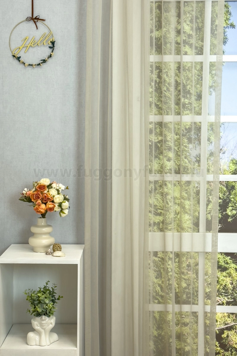 A minta nélküli anyagok univerzálisak, jól passzolnak bármihez A minta nélküli anyagokhoz bármilyen színben harmonizáló mintás anyagot, tapétát remekül párosíthatunk. A barna és terrakotta szín a föld, a kitartás és kifinomultság jelképe A barnákat a kényelem és melegség kifejezésére használhatjuk. Élénk, gazdag árnyalatok alkalmazásával luxust és finomságot sugallhatunk. A barna, terrakotta színű fényáteresztő függönyökhöz általában a sötétbarna, bézs, sárga színű sötétítő és dekorfüggönyök illenek legjobban.Ez a függöny többféle lakberendezési stílushoz is jól illeszthető Ez a függöny több lakberendezési irányzathoz is tökéletesen illeszkedik – legyen szó a minimál letisztultságról, a skandináv egyszerűségről, a mediterrán könnyedségről vagy a klasszikus eleganciáról. Anyaga diszkréten simul bele a térbe, miközben kiemeli a helyiség hangulatát. Ideális választás, ha olyan textilt keresünk, amely rugalmasan alkalmazkodik a meglévő bútorokhoz és kiegészítőkhöz.Anyaga: sablé Változó vastagságú szálakból szőtt anyag. Kevésbé hajlamos a gyűrődésre , mint a voile. 1.5x-es ráncolással ajánljuk.Terasz ajtókhoz, nagyobb ablakok függönyözéséhez jól használható A karnistól a felső szegéshez szükséges anyagot beleszámítva legfeljebb 298 cm hosszú függönyt lehet belőle varrni, ez alatt bármilyen méretben elkészítjük. Méreténél fogva alkalmas lehet terasz- és erkélyajtók, nagy belmagasságú helyiségek valamint normál ablakok függönyözésére is. A függöny aljába gyárilag varrt ólomzsinór megfelelő esést kölcsönöz a függönynek, megakadályozza az indokolatlan fellebbenést és az apróbb ráncokat is kisimítja.