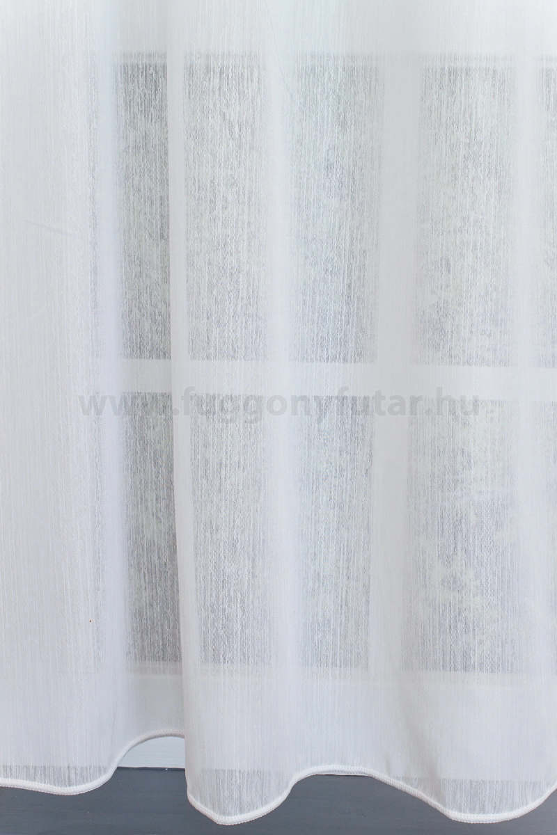 Ha nagyobb felületre gazdaságos, könnyen kezelhető, tartós függönyt szeretne, akkor ez a fehér sablet függöny jó választás. Függőleges irányban erősebb, sodrott fonalak adnak kellő tartást, és cirkás mintázatot. Alul ólomzsinór szegélyezi. Kímélő mosás után helyére akasztva szárítható, gőzölős vasalóval simítható. A szórt mintás anyagok izgalmas felülete bármely helyiségben jól mutat Az anyag teljes felületén elszórtan megjelenő ritkább-sűrűbb szálbeszövések izgalmas felületet hoznak létre. Bármilyen, színben harmonizáló, mintás anyagot remekül párosíthatunk hozzá. A fehér szín légies és világos, fényt hoz a szobába A fehér a világosság és a tisztaság színe, egész nap érezhetjük a friss tavaszi szellő simogatását, ha egy szép fehér függöny díszíti az ablakunkat. A fehér színű fényáteresztő függönyöket bármilyen színű sötétítő függönnyel kombinálhatjuk, de a szoba falának színét mindig vegyük figyelembe.Ez a függöny többféle lakberendezési stílushoz is jól illeszthető Ez a függöny több lakberendezési irányzathoz is tökéletesen illeszkedik – legyen szó a skandináv egyszerűségről, a klasszikus eleganciáról vagy a minimál letisztultságról. Anyaga diszkréten simul bele a térbe, miközben kiemeli a helyiség hangulatát. Ideális választás, ha olyan textilt keresünk, amely rugalmasan alkalmazkodik a meglévő bútorokhoz és kiegészítőkhöz.A légies elegancia harmóniája A nyár típusú anyagok a kifinomult, hűvös eleganciát képviselik. Színvilágukban a hideg pasztellek, mint a levendula, a menta, a púderrózsaszín és a törtfehérek uralkodnak. Könnyed, szellős anyagaikkal nyugalmat és szofisztikált hangulatot teremtenek. Ideális választás a higgadt, elegáns személyiségeknek. Anyaga diszkréten simul bele a térbe, miközben kiemeli a helyiség hangulatát. Ideális választás, ha olyan textilt keresünk, amely rugalmasan alkalmazkodik a meglévő bútorokhoz és kiegészítőkhöz.Anyaga: sablé Változó vastagságú szálakból szőtt anyag. Kevésbé hajlamos a gyűrődésre , mint a voile. 1.5x-es ráncolással ajánljuk.Terasz ajtókhoz, nagyobb ablakok függönyözéséhez jól használható A karnistól a felső szegéshez szükséges anyagot beleszámítva legfeljebb 298 cm hosszú függönyt lehet belőle varrni, ez alatt bármilyen méretben elkészítjük. Méreténél fogva alkalmas lehet terasz- és erkélyajtók, nagy belmagasságú helyiségek valamint normál ablakok függönyözésére is. A függöny aljába gyárilag varrt ólomzsinór megfelelő esést kölcsönöz a függönynek, megakadályozza az indokolatlan fellebbenést és az apróbb ráncokat is kisimítja.