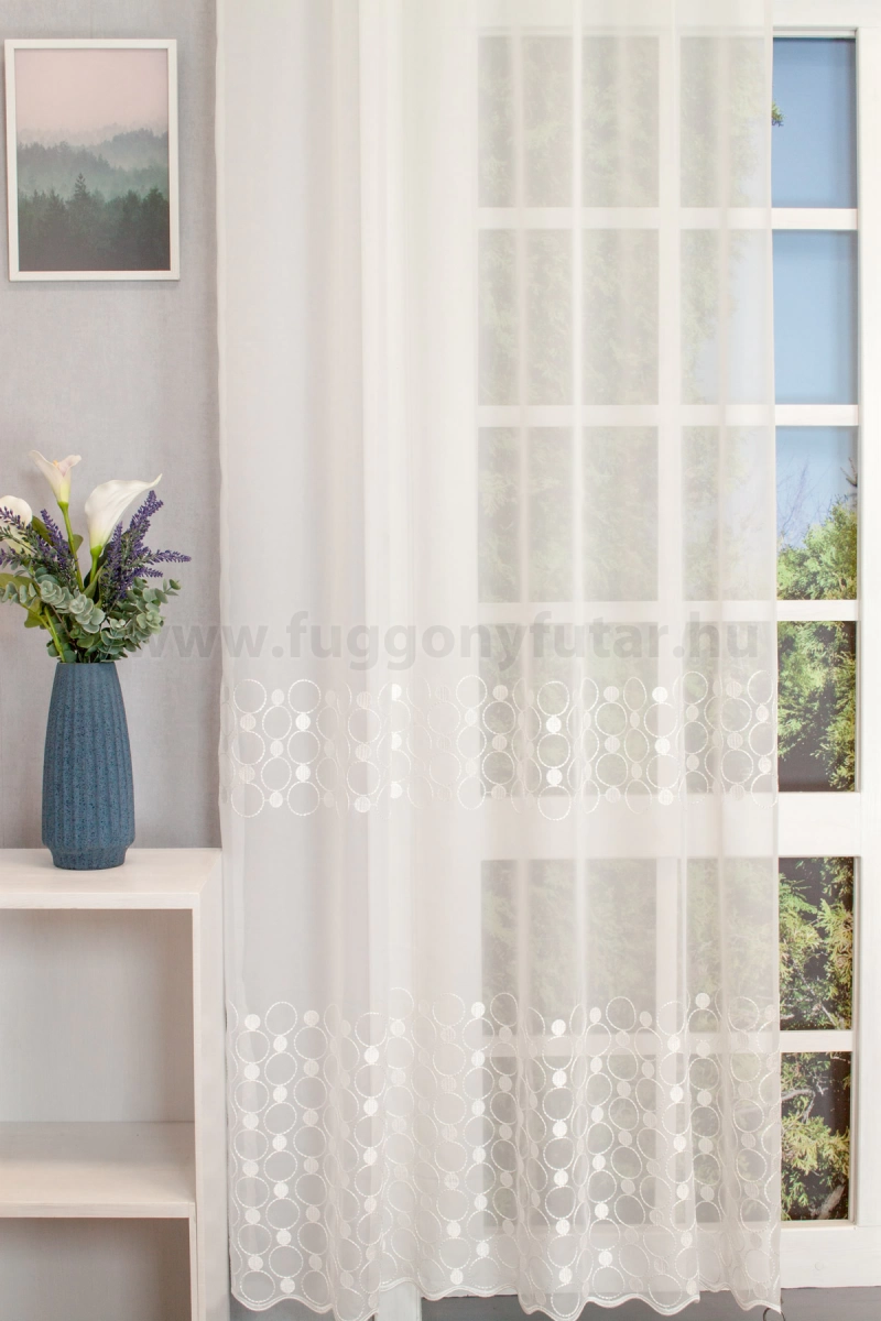 Derűs, napfényes hatást kelt ez a könnyű, bordűrös voile függöny. Finom szövésű anyaga átengedi a fényt, körkörös, fényes fonallal hímzett mintázata kedves hangulatot áraszt. A széles bordűrös sáv kellő tartást biztosít, kissé akadályozza a belátást is. Kímélő mosás után helyére akasztva szárítható, gőzölős vasalóval simítható.A geometrikus mintákkal otthonunk megtelik eleganciával, mégis egyszerű és modern marad Egyszerű formák ritmusos ismétlődése jellemzi legjobban ezt a geometrikus mintázatú anyagot. Egyszínű vagy visszafogott mintázatú sötétítővel párosítsuk, hogy hangsúlyos maradhasson a függöny formavilága. A bézs szín kellemes melegséggel árasztja el szobánkat Ez a meleg, természetes árnyalatú anyag remekül mutat bármilyen térben, amit otthonos, meleg színekkel szeretnénk berendezni. A bézs színű fényáteresztő függönyökhöz általában a sötétbarna, sötétkék, bordó, zöld, narancs, lila és szürke színű sötétítő és dekorfüggönyök illenek legjobban.Anyaga: voile Vékony, könnyed, fátyolszerű anyag . Az organzához képest vastagabb szálakból szövik, így kevésbé átlátszó, nehezebben gyűrődik, bár vasalást azért igényel (gőzölős vasalóval viszonylag könnyen, sérülésmentesen vasalható). 1.5x v. 2x-es ráncolással ajánljuk.Normál ablakok függönyözéséhez használható A karnistól a felső szegéshez szükséges anyagot beleszámítva legfeljebb 208 cm hosszú függönyt lehet belőle varrni, ez alatt bármilyen méretben elkészítjük. Méreténél fogva normál méretű ablakok függönyözésére alkalmas. Alsó szegélye hullámos, melyhez nagyobb díszítősáv (bordűr) párosul, ólomzsinór nem található benne.