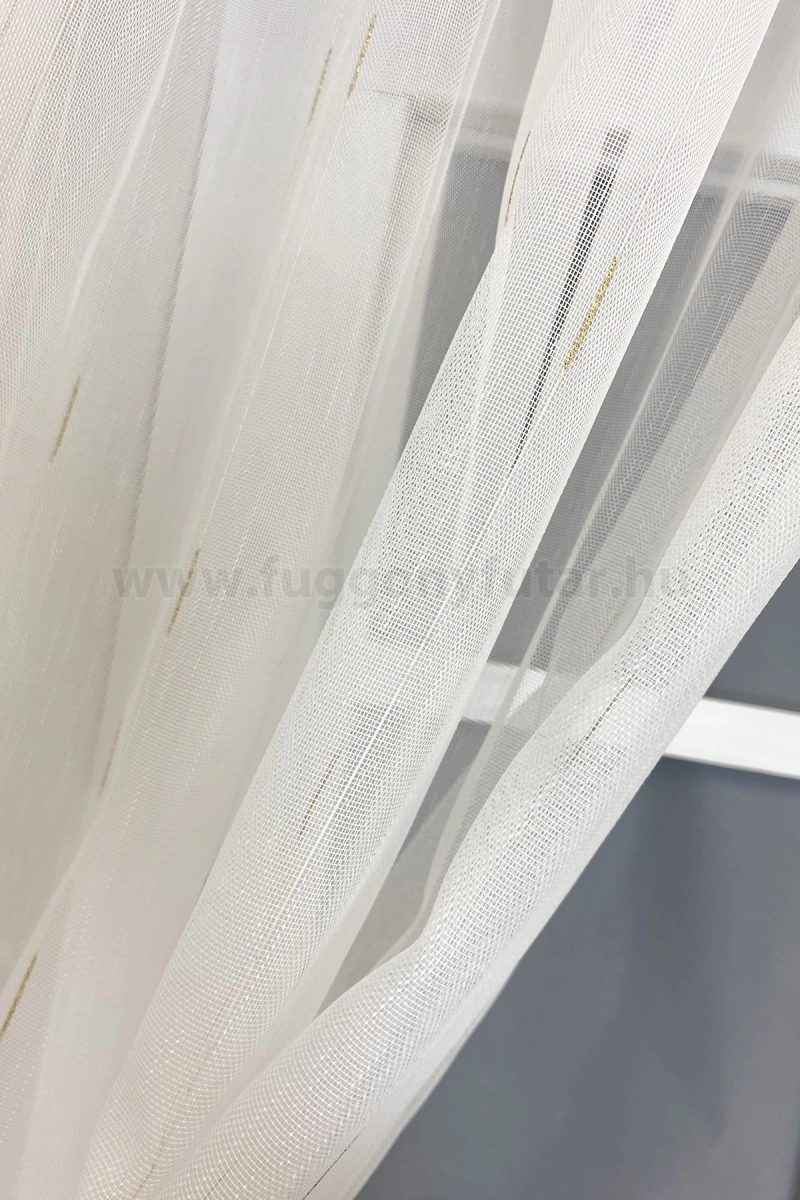 Ünnepélyes, mégis elegánsan visszafogott ez az arany szálbeszövéses függöny. Meleg színű, sötétebb bútorok között érvényesül igazán.A szórt mintás anyagok izgalmas felülete bármely helyiségben jól mutat Az anyag teljes felületén elszórtan megjelenő ritkább-sűrűbb szálbeszövések izgalmas felületet hoznak létre. Bármilyen, színben harmonizáló, mintás anyagot remekül párosíthatunk hozzá. A bézs szín kellemes melegséggel árasztja el szobánkat Ez a meleg, természetes árnyalatú anyag remekül mutat bármilyen térben, amit otthonos, meleg színekkel szeretnénk berendezni. A bézs, mintás fényáteresztő függönyökhöz általában a sötétbarna, sötétkék, bordó, zöld, narancs, lila és szürke színű sötétítő és dekorfüggönyök illenek legjobban.Ez a függöny többféle lakberendezési stílushoz is jól illeszthető Ez a függöny több lakberendezési irányzathoz is tökéletesen illeszkedik – legyen szó a glamour luxusáról, a klasszikus eleganciáról, a minimál letisztultságról vagy az Art deco ragyogásáról. Anyaga diszkréten simul bele a térbe, miközben kiemeli a helyiség hangulatát. Ideális választás, ha olyan textilt keresünk, amely rugalmasan alkalmazkodik a meglévő bútorokhoz és kiegészítőkhöz.Anyaga: jacquard Csipkekötéshez hasonló technikával készült anyag, melyet elsősorban a romantikus vagy klasszikus lakberendezési stílus kedvelőinek ajánlunk. Nem szükséges különösebben vasalni , mosás után elég nedvesen felfüggeszteni, súlya miatt simára szárad (ahogy szokták mondani, "kihúzza" magát). 1.5x-es ráncolással ajánljuk.Normál ablakok függönyözéséhez használható A karnistól a felső szegéshez szükséges anyagot beleszámítva legfeljebb 173 cm hosszú függönyt lehet belőle varrni, ez alatt bármilyen méretben elkészítjük. Méreténél fogva normál méretű ablakok függönyözésére alkalmas. A függöny aljába gyárilag varrt ólomzsinór megfelelő esést kölcsönöz a függönynek, megakadályozza az indokolatlan fellebbenést és az apróbb ráncokat is kisimítja.Vasalást kevésbé igénylő anyag Az anyag kevesebb vasalást igényel, mint az átlag függöny. Sokszor elég, ha mosás után még nedvesen a helyükre akasztjuk, így kilógva magát a ráncok kisimulnak és a függönyünk teljes pompájában ragyog!