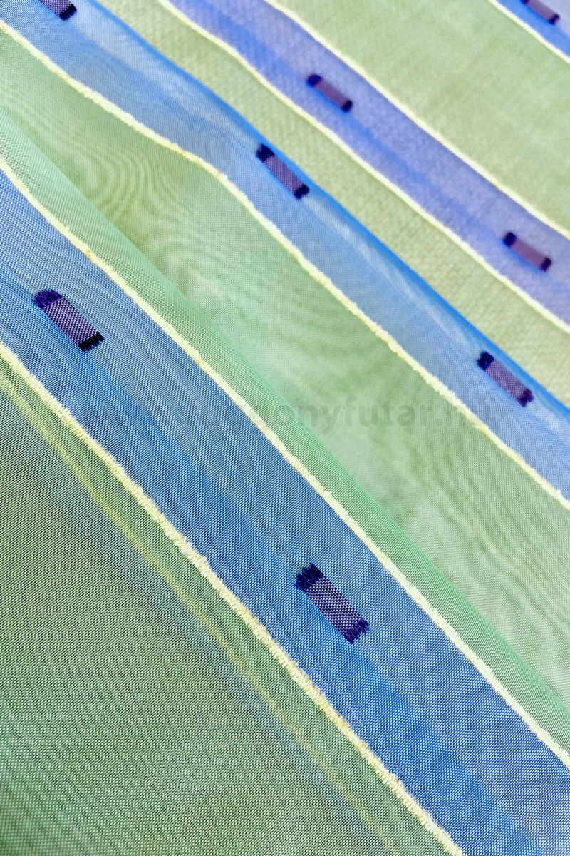 Napfényes szobában, modern stílusú, világos bútorok között mutat legjobban ez a halványzöld, kék csíkos voile függöny. Színei nyugtató hatásúak, mintáját és felületét puha sárga zsenília szál és sötétkék nyírt minták teszik változatossá. Könnyen kezelhető, kímélő mosás után helyére akasztva szárítható, gőzölős vasalóval simítható.A függőleges csíkok izgalmassá teszik a teret Az ilyen függőleges csíkozású anyagokhoz válasszunk egyszínű, szórt vagy virágmintás sötétítőt. Ez a mintázat optikailag nyújtja a teret. Tengert idéző türkiz Ez a tengert idéző kékeszöld árnyalatú anyag stílusos megjelenést ad bármelyik helyiségnek. Semleges meleg színnel vagy pasztell színekkel párosítva divatos színkombinációkat kreálhatunk. A türkiz színű fényáteresztő függönyökhöz általában a hasonló tónusú türkiz, zöld, kék, sötétkék, sárga, fekete és szürke színű sötétítő és dekorfüggönyök illenek legjobban.Anyaga: voile Vékony, könnyed, fátyolszerű anyag . Az organzához képest vastagabb szálakból szövik, így kevésbé átlátszó, nehezebben gyűrődik, bár vasalást azért igényel (gőzölős vasalóval viszonylag könnyen, sérülésmentesen vasalható). 1.5x v. 2x-es ráncolással ajánljuk.Terasz ajtókhoz, nagyobb ablakok függönyözéséhez jól használható A karnistól a felső szegéshez szükséges anyagot beleszámítva legfeljebb 298 cm hosszú függönyt lehet belőle varrni, ez alatt bármilyen méretben elkészítjük. Méreténél fogva alkalmas lehet terasz- és erkélyajtók, nagy belmagasságú helyiségek valamint normál ablakok függönyözésére is. A függöny aljába gyárilag varrt ólomzsinór megfelelő esést kölcsönöz a függönynek, megakadályozza az indokolatlan fellebbenést és az apróbb ráncokat is kisimítja.