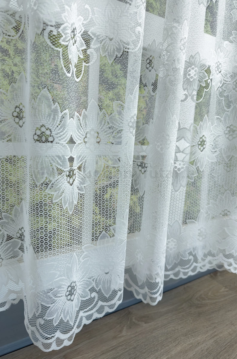 Teremtsünk romantikus hangulatot szobánkba ezzel a kellemes, virágmintás anyaggal! A virágminták vagy növényi minták mindig is népszerűek voltak a textiltervezők és lakberendezők körében, hiszen barátságossá és természetközelivé teszik otthonunkat. Egyszínű, színben harmonizáló textilekkel kombinálva romantikus stílust és kiegyensúlyozott megjelenést kölcsönözhetünk helyiségünknek. A fehér szín légies és világos, fényt hoz a szobába A fehér a világosság és a tisztaság színe, egész nap érezhetjük a friss tavaszi szellő simogatását, ha egy szép fehér függöny díszíti az ablakunkat. A fehér színű fényáteresztő függönyöket bármilyen színű sötétítő függönnyel kombinálhatjuk, de a szoba falának színét mindig vegyük figyelembe.Ez a függöny többféle lakberendezési stílushoz is jól illeszthető Ez a függöny több lakberendezési irányzathoz is tökéletesen illeszkedik – legyen szó a vintage nosztalgiáról vagy a klasszikus eleganciáról. Anyaga diszkréten simul bele a térbe, miközben kiemeli a helyiség hangulatát. Ideális választás, ha olyan textilt keresünk, amely rugalmasan alkalmazkodik a meglévő bútorokhoz és kiegészítőkhöz.Anyaga: jacquard Csipkekötéshez hasonló technikával készült anyag, melyet elsősorban a romantikus vagy klasszikus lakberendezési stílus kedvelőinek ajánlunk. Nem szükséges különösebben vasalni , mosás után elég nedvesen felfüggeszteni, súlya miatt simára szárad (ahogy szokták mondani, "kihúzza" magát). 1.5x-es ráncolással ajánljuk.Normál ablakok függönyözéséhez használható A karnistól a felső szegéshez szükséges anyagot beleszámítva legfeljebb 218 cm hosszú függönyt lehet belőle varrni, ez alatt bármilyen méretben elkészítjük. Méreténél fogva normál méretű ablakok függönyözésére alkalmas. Alsó szegélye hullámos, melyhez nagyobb díszítősáv (bordűr) párosul, ólomzsinór nem található benne.Vasalást kevésbé igénylő anyag Az anyag kevesebb vasalást igényel, mint az átlag függöny. Sokszor elég, ha mosás után még nedvesen a helyükre akasztjuk, így kilógva magát a ráncok kisimulnak és a függönyünk teljes pompájában ragyog!