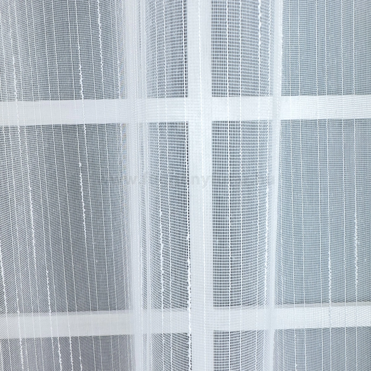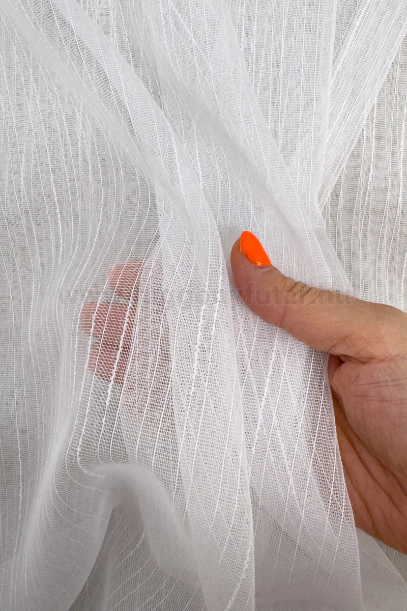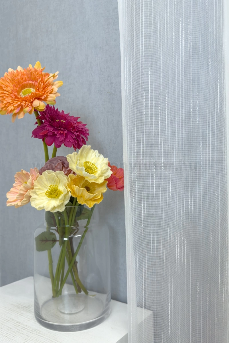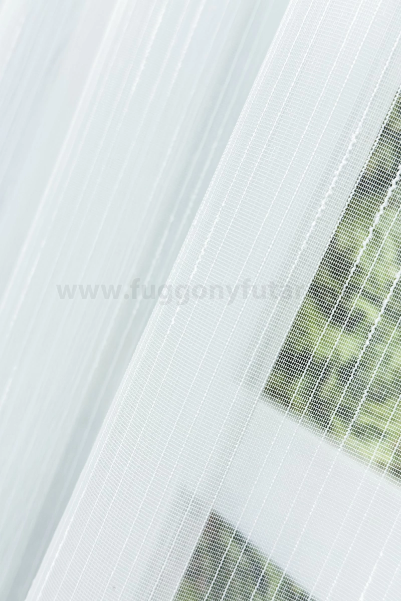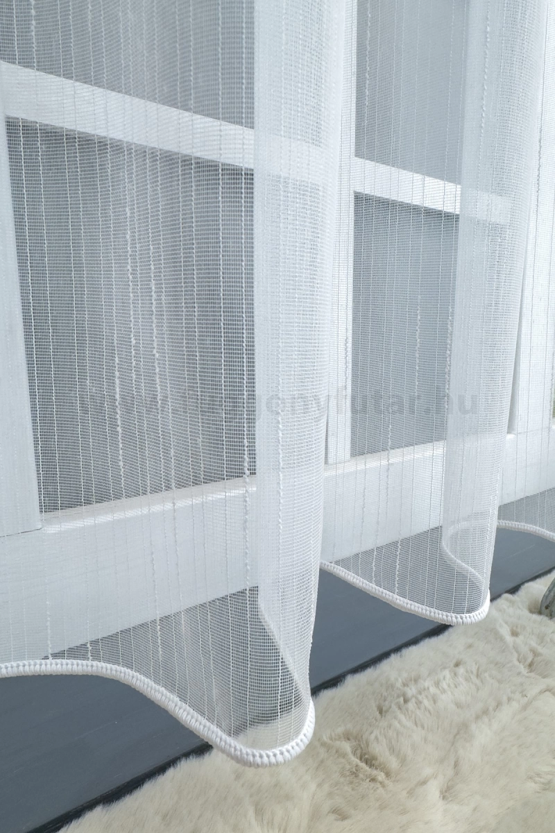 A függőleges csíkok izgalmassá teszik a teret Az ilyen függőleges csíkozású anyagokhoz válasszunk egyszínű, szórt vagy virágmintás sötétítőt. Ez a mintázat optikailag nyújtja a teret. A fehér szín légies és világos, fényt hoz a szobába A fehér a világosság és a tisztaság színe, egész nap érezhetjük a friss tavaszi szellő simogatását, ha egy szép fehér függöny díszíti az ablakunkat. A fehér színű fényáteresztő függönyöket bármilyen színű sötétítő függönnyel kombinálhatjuk, de a szoba falának színét mindig vegyük figyelembe.Ez a függöny többféle lakberendezési stílushoz is jól illeszthető Ez a függöny több lakberendezési irányzathoz is tökéletesen illeszkedik – legyen szó a minimál letisztultságról vagy a skandináv egyszerűségről. Anyaga diszkréten simul bele a térbe, miközben kiemeli a helyiség hangulatát. Ideális választás, ha olyan textilt keresünk, amely rugalmasan alkalmazkodik a meglévő bútorokhoz és kiegészítőkhöz.Anyaga: sablé Változó vastagságú szálakból szőtt anyag. Kevésbé hajlamos a gyűrődésre , mint a voile. 1.5x-es ráncolással ajánljuk.Terasz ajtókhoz, nagyobb ablakok függönyözéséhez jól használható A karnistól a felső szegéshez szükséges anyagot beleszámítva legfeljebb 298 cm hosszú függönyt lehet belőle varrni, ez alatt bármilyen méretben elkészítjük. Méreténél fogva alkalmas lehet terasz- és erkélyajtók, nagy belmagasságú helyiségek valamint normál ablakok függönyözésére is. A függöny aljába gyárilag varrt ólomzsinór megfelelő esést kölcsönöz a függönynek, megakadályozza az indokolatlan fellebbenést és az apróbb ráncokat is kisimítja.Vasalást kevésbé igénylő anyag Az anyag kevesebb vasalást igényel, mint az átlag függöny. Sokszor elég, ha mosás után még nedvesen a helyükre akasztjuk, így kilógva magát a ráncok kisimulnak és a függönyünk teljes pompájában ragyog!