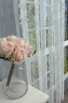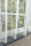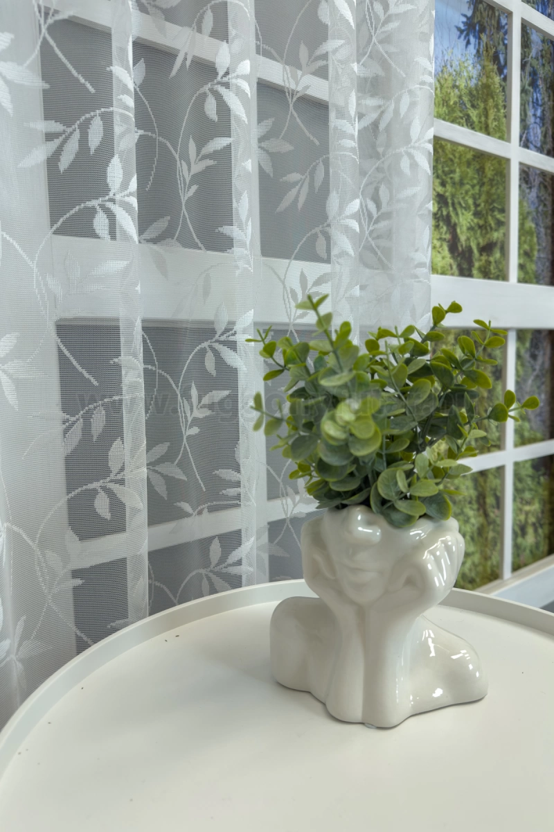 Teremtsünk romantikus hangulatot szobánkba ezzel a kellemes, növényi mintás anyaggal! A növényi minták mindig is népszerűek voltak a textiltervezők és lakberendezők körében, hiszen barátságossá és természetközelivé teszik otthonunkat. Egyszínű, színben harmonizáló textilekkel kombinálva romantikus stílust és kiegyensúlyozott megjelenést kölcsönözhetünk helyiségünknek. A fehér szín légies és világos, fényt hoz a szobába A fehér a világosság és a tisztaság színe, egész nap érezhetjük a friss tavaszi szellő simogatását, ha egy szép fehér függöny díszíti az ablakunkat. A fehér színű fényáteresztő függönyöket bármilyen színű sötétítő függönnyel kombinálhatjuk, de a szoba falának színét mindig vegyük figyelembe.Ez a függöny többféle lakberendezési stílushoz is jól illeszthető Ez a függöny több lakberendezési irányzathoz is tökéletesen illeszkedik – legyen szó a vintage nosztalgiáról, a mediterrán könnyedségről vagy a skandináv egyszerűségről. Anyaga diszkréten simul bele a térbe, miközben kiemeli a helyiség hangulatát. Ideális választás, ha olyan textilt keresünk, amely rugalmasan alkalmazkodik a meglévő bútorokhoz és kiegészítőkhöz.Anyaga: jacquard Csipkekötéshez hasonló technikával készült anyag, melyet elsősorban a romantikus vagy klasszikus lakberendezési stílus kedvelőinek ajánlunk. Nem szükséges különösebben vasalni , mosás után elég nedvesen felfüggeszteni, súlya miatt simára szárad (ahogy szokták mondani, "kihúzza" magát). 1.5x-es ráncolással ajánljuk.Terasz ajtókhoz, nagyobb ablakok függönyözéséhez jól használható A karnistól a felső szegéshez szükséges anyagot beleszámítva legfeljebb 278 cm hosszú függönyt lehet belőle varrni, ez alatt bármilyen méretben elkészítjük. Méreténél fogva alkalmas lehet terasz- és erkélyajtók, nagy belmagasságú helyiségek valamint normál ablakok függönyözésére is. A függöny alsó szegélye hullámos, ólomzsinór nem található benne.Vasalást kevésbé igénylő anyag Az anyag kevesebb vasalást igényel, mint az átlag függöny. Sokszor elég, ha mosás után még nedvesen a helyükre akasztjuk, így kilógva magát a ráncok kisimulnak és a függönyünk teljes pompájában ragyog!