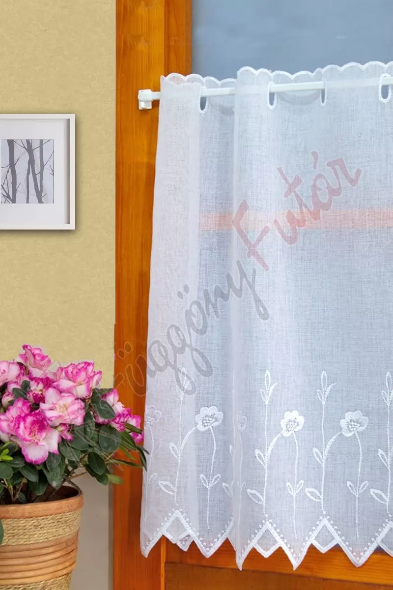 Ezt a fehér, kávéházi sablé függönyt klasszikus, vintage és modern berendezésű helyiségbe egyaránt ajánljuk.Alsó szegélyét hímzett vadvirágok díszítik. Alja cikk-cakkosan szegett, felül vitrázs bújtatóval.