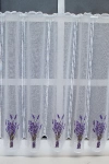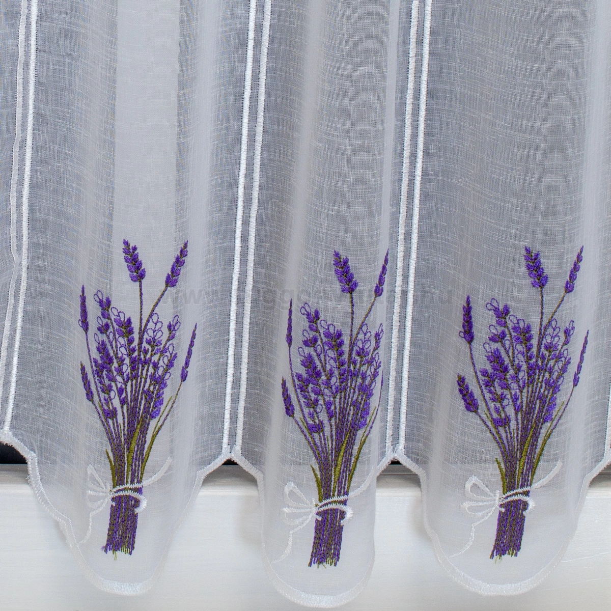 Fehér alapon lila levendula virág mintás hímzett batiszt vitrázs függöny.Teremtsünk romantikus hangulatot szobánkba ezzel a kellemes, virágmintás anyaggal! A virágminták vagy növényi minták mindig is népszerűek voltak a textiltervezők és lakberendezők körében, hiszen barátságossá és természetközelivé teszik otthonunkat. Egyszínű, színben harmonizáló textilekkel kombinálva romantikus stílust és kiegyensúlyozott megjelenést kölcsönözhetünk helyiségünknek. A fehér szín légies és világos, fényt hoz a szobába A fehér a világosság és a tisztaság színe, egész nap érezhetjük a friss tavaszi szellő simogatását, ha egy szép fehér függöny díszíti az ablakunkat. A fehér színű fényáteresztő függönyöket bármilyen színű sötétítő függönnyel kombinálhatjuk, de a szoba falának színét mindig vegyük figyelembe.Ez a függöny vintage lakberendezési stílushoz jól illeszthető Ez a függöny tökéletesen illeszkedik a vintage stílus nosztalgiájához. Anyaga diszkréten simul bele a térbe, miközben kiemeli a helyiség hangulatát. Ideális választás, ha olyan textilt keresünk, amely rugalmasan alkalmazkodik a meglévő bútorokhoz és kiegészítőkhöz.A légies elegancia harmóniája A nyár típusú anyagok a kifinomult, hűvös eleganciát képviselik. Színvilágukban a hideg pasztellek, mint a levendula, a menta, a púderrózsaszín és a törtfehérek uralkodnak. Könnyed, szellős anyagaikkal nyugalmat és szofisztikált hangulatot teremtenek. Ideális választás a higgadt, elegáns személyiségeknek. Anyaga diszkréten simul bele a térbe, miközben kiemeli a helyiség hangulatát. Ideális választás, ha olyan textilt keresünk, amely rugalmasan alkalmazkodik a meglévő bútorokhoz és kiegészítőkhöz.Anyaga: batiszt Vékony, de kevésbé áttetsző, sűrűn szövött anyag, mely tapintásra a leginkább közelít a pamutvászonhoz. 1.5x-es ráncolással ajánljuk.Vitrázsrudakhoz alkalmas függöny A függöny 60 cm magas. Méreténél fogva ún. kávéházi vagy vitrázs függgönyként használható, az ablak egy részének takarására alkalmas. Alsó szegélye hullámos, melyhez nagyobb díszítősáv (bordűr) párosul, ólomzsinór nem található benne.Vasalást kevésbé igénylő anyag Az anyag kevesebb vasalást igényel, mint az átlag függöny. Sokszor elég, ha mosás után még nedvesen a helyükre akasztjuk, így kilógva magát a ráncok kisimulnak és a függönyünk teljes pompájában ragyog!