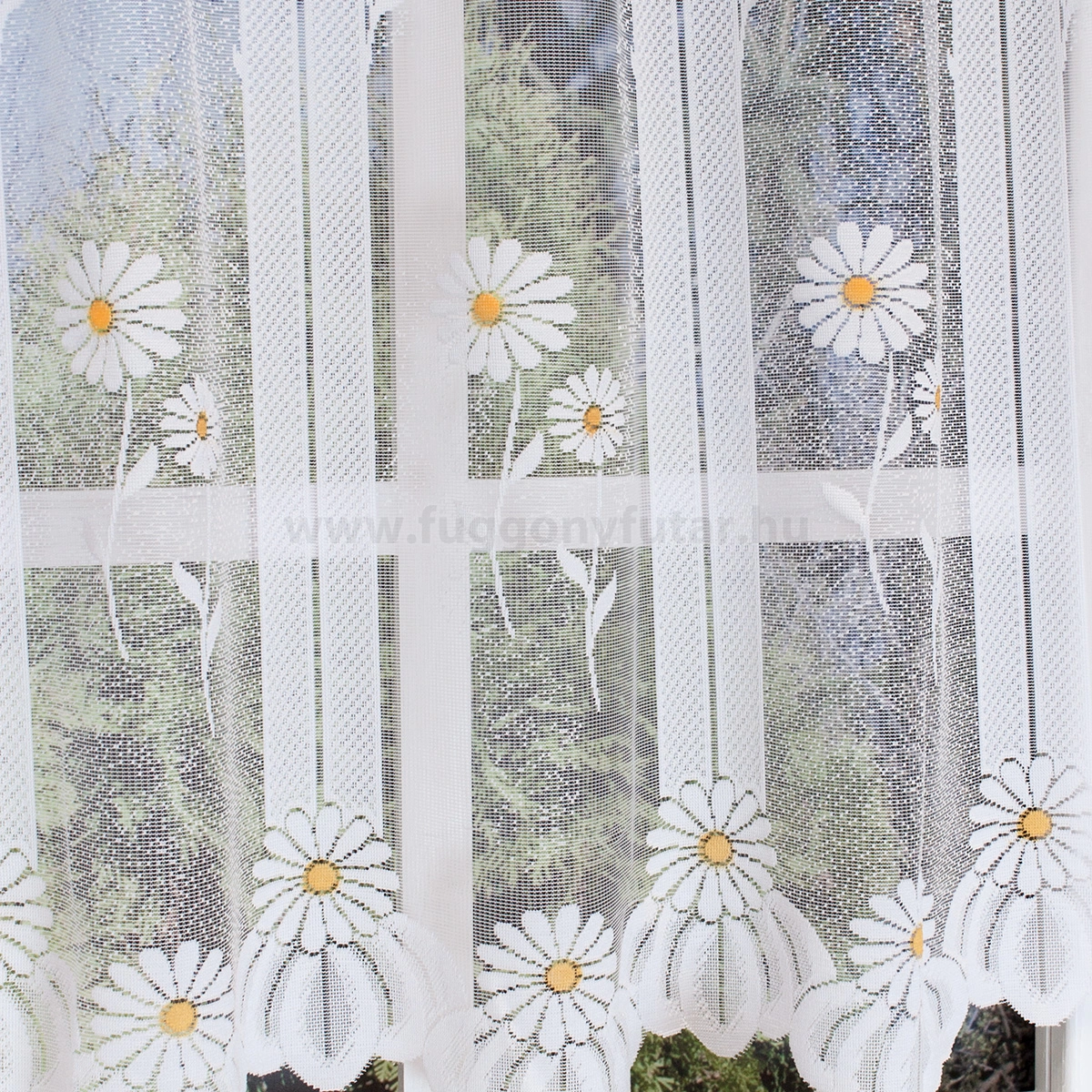 Nagyon könnyen kezelhető ez a fehér, margaréta mintás jacquard vitrázs függöny. 20 cm széles oszlopokban 15 cm magas virágok hajladoznak. Alul 10 cm-es virágos bordűr szegélyezi. Ugyan ezzel a mintával 180 cm magas fényáteresztő függönyt is lehet alkalmazni.Teremtsünk romantikus hangulatot szobánkba ezzel a kellemes, virágmintás anyaggal! A virágminták vagy növényi minták mindig is népszerűek voltak a textiltervezők és lakberendezők körében, hiszen barátságossá és természetközelivé teszik otthonunkat. Egyszínű, színben harmonizáló textilekkel kombinálva romantikus stílust és kiegyensúlyozott megjelenést kölcsönözhetünk helyiségünknek. A fehér szín légies és világos, fényt hoz a szobába A fehér a világosság és a tisztaság színe, egész nap érezhetjük a friss tavaszi szellő simogatását, ha egy szép fehér függöny díszíti az ablakunkat. A fehér színű fényáteresztő függönyöket bármilyen színű sötétítő függönnyel kombinálhatjuk, de a szoba falának színét mindig vegyük figyelembe.Ez a függöny vintage lakberendezési stílushoz jól illeszthető Ez a függöny tökéletesen illeszkedik a vintage stílus nosztalgiájához. Anyaga diszkréten simul bele a térbe, miközben kiemeli a helyiség hangulatát. Ideális választás, ha olyan textilt keresünk, amely rugalmasan alkalmazkodik a meglévő bútorokhoz és kiegészítőkhöz.Anyaga: jacquard Csipkekötéshez hasonló technikával készült anyag, melyet elsősorban a romantikus vagy klasszikus lakberendezési stílus kedvelőinek ajánlunk. Nem szükséges különösebben vasalni , mosás után elég nedvesen felfüggeszteni, súlya miatt simára szárad (ahogy szokták mondani, "kihúzza" magát). 1.5x-es ráncolással ajánljuk.Vitrázsrudakhoz alkalmas függöny A függöny 80 cm magas. Méreténél fogva ún. kávéházi vagy vitrázs függgönyként használható, az ablak egy részének takarására alkalmas. A függöny alsó szegélye hullámos, ólomzsinór nem található benne.Vasalást kevésbé igénylő anyag Az anyag kevesebb vasalást igényel, mint az átlag függöny. Sokszor elég, ha mosás után még nedvesen a helyükre akasztjuk, így kilógva magát a ráncok kisimulnak és a függönyünk teljes pompájában ragyog!