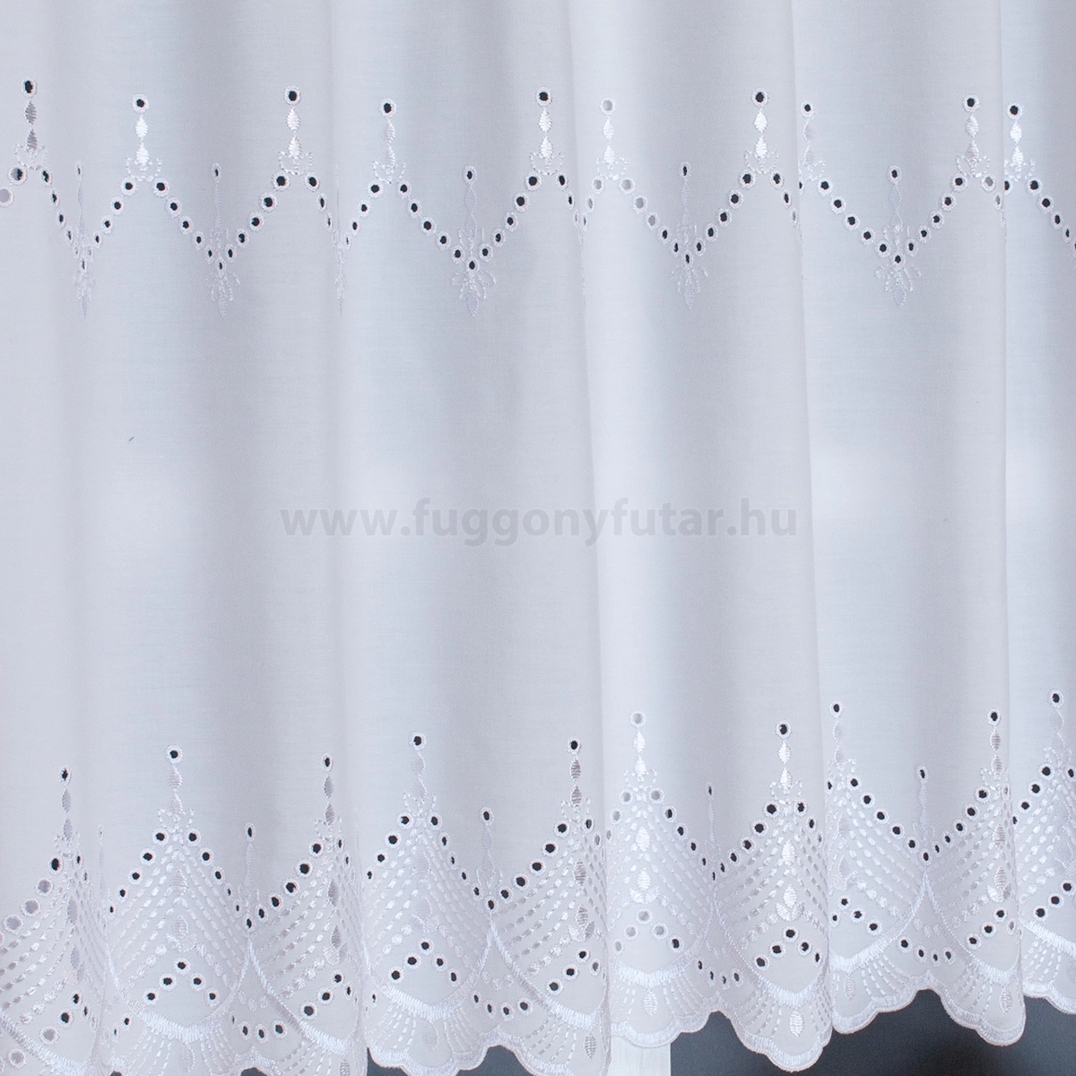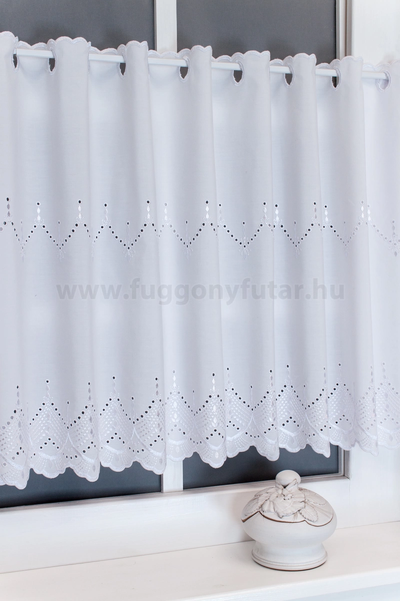 Fehér színű, pamutvászon hatású fényáteresztő vitrázs függöny, lyukhímzéses mintával, 45 cm - egyedi méretre varrjuk!