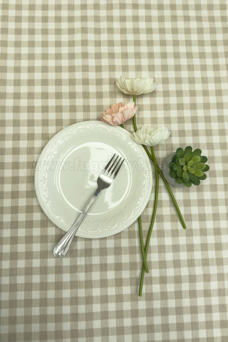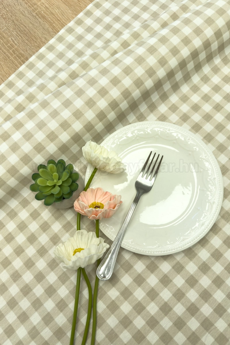 Drapp színű nagyokckás, vízlepergető vászon dekor anyag, egyedi méretű asztalterítő