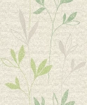 Fehér alapon zöld és ezüst színű növényi mintás tapéta. Az ezüst színű minta fény hatására csillogó hatást eredményez. Felülete strukturált.