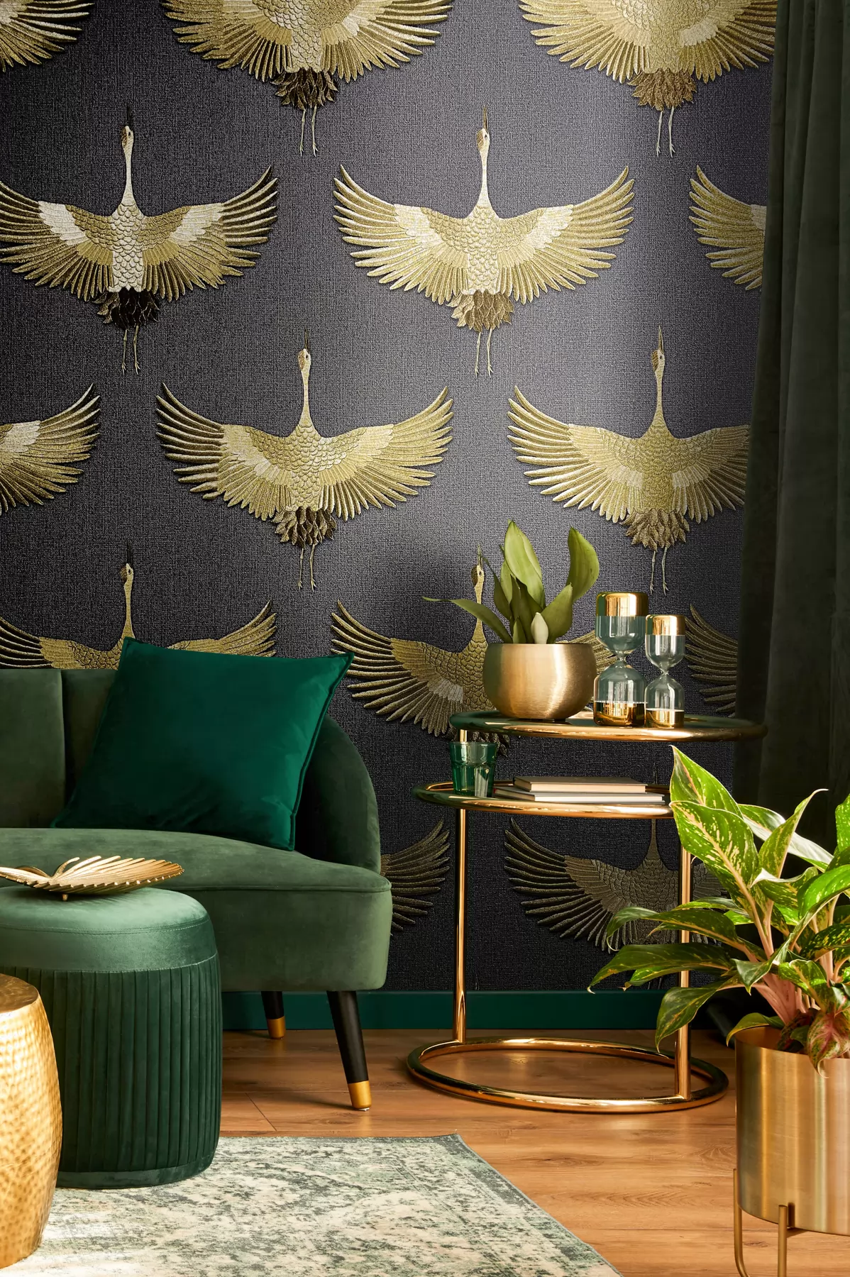 Sötétszürke alapon arany színű darumadár mintás Vlies tapéta, Kumano 1834532